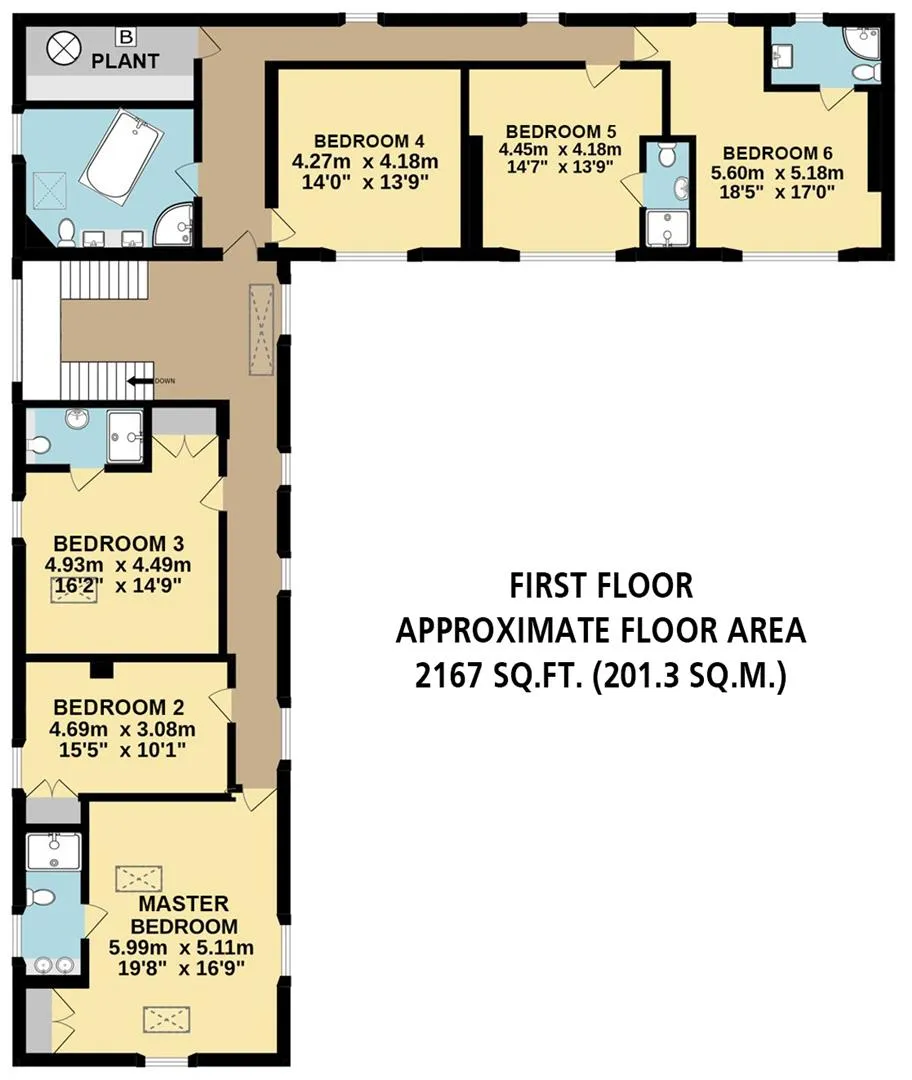 On the first floor: Landing, bedroom 3, bedroom 3 en-suite, bedroom 2, master bedroom, master en-suite, inner landing, family bathroom, bedroom 4, plant room, bedroom 5, bedroom 5 en-suite, bedroom 6 and bedroom 6 en-suite.