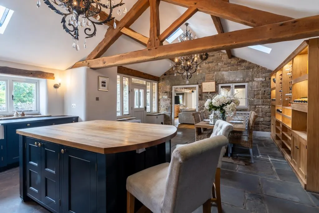 A stunning dining kitchen showcasing a high, vaulted ceiling that is enhanced with exposed timber beams and a truss. Having side facing hardwood double glazed windows, aluminium double glazed roof windows, pendant light points and exposed stone walling. Also having wall mounted light points, central heating radiators with decorative covers and stone flagged flooring. There is a range of fitted base/wall and drawer units, incorporating matching slate work surfaces, tiled splash backs, under-counter lighting and a Twyford Belfast style sink with a chrome mixer tap and an additional filtered water tap. There is a central island with an oak work surface, providing additional storage and seating for two chairs. The appliances include an electric Aga with two hot plates, two ovens and an Bosch extractor fan above, Smeg dishwasher, Hotpoint fridge and an Indesit freezer. A hardwood door with a glazed panel opens to the lounge.