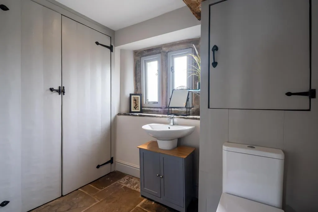 Having a rear facing hardwood double glazed window, an exposed timber beam, recessed lighting, a central heating radiator and stone flagged flooring. There is a suite in white, which comprises of a low-level WC and a wall mounted wash hand basin with an Instinct chrome mixer tap. A cupboard houses the boiler and double timber doors open to a utility cupboard. The utility cupboard has a shelf, an inset cupboard housing the fuse box and space/provision for an automatic washing machine and a tumble dryer.