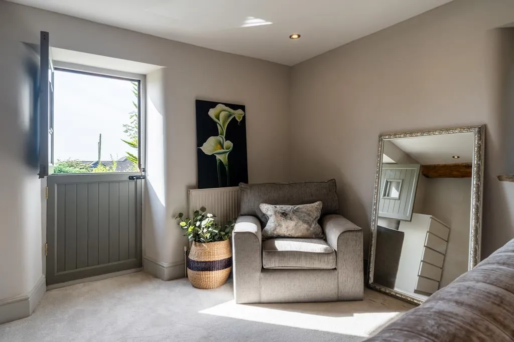 A spacious master bedroom with front and side facing hardwood double glazed windows, an exposed timber beam, recessed lighting, central heating radiators and a telephone point. An oak door opens to the master en-suite. A hardwood stable-style door with a glazed panel opens to a stone staircase with wrought iron balustrading, which leads down to the rear garden.