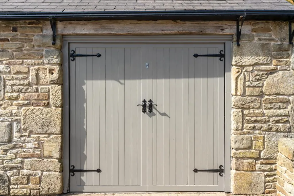 Having an electric up-and-over door and light. A timber door within a partition wall opens to a store.