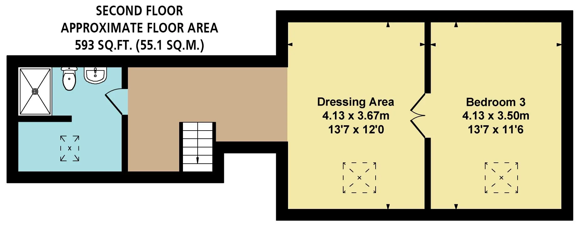 On the second floor: Landing, shower room, bedroom 3 dressing area and bedroom 3.