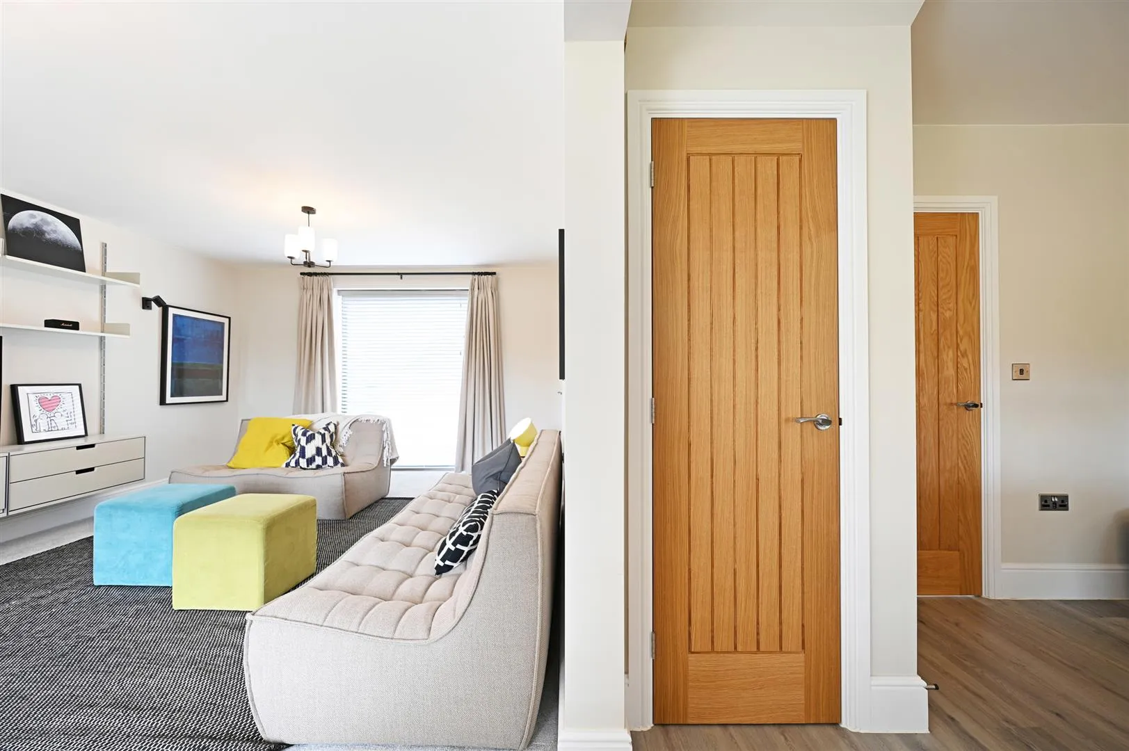 Having a front facing aluminium double glazed panel, pendant light point, recessed lighting, data point and timber flooring with under floor heating. Timber doors open to the lounge, utility room, WC, and dining kitchen.