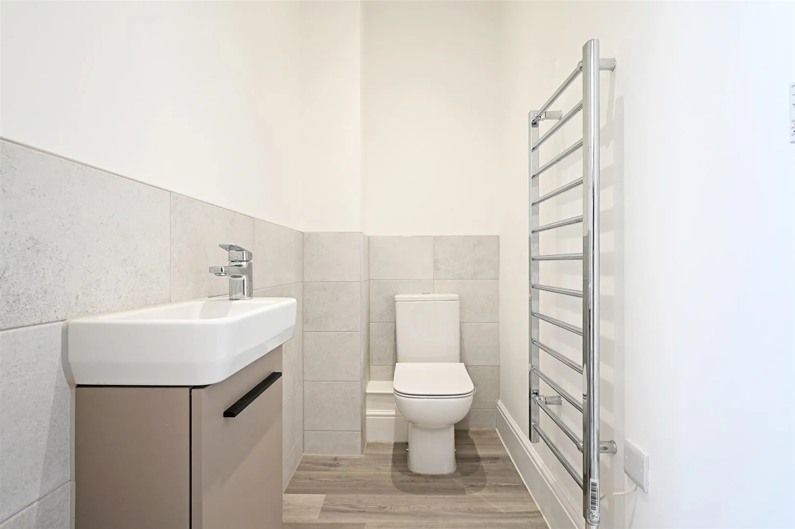 With a side facing aluminium double glazed window, recessed lighting, extractor fan, chrome heated towel rail, shaver point, partially tiled walls and tiled flooring. There is a suite in white comprising a low-level WC and a wash had basin with a chrome mixer tap.