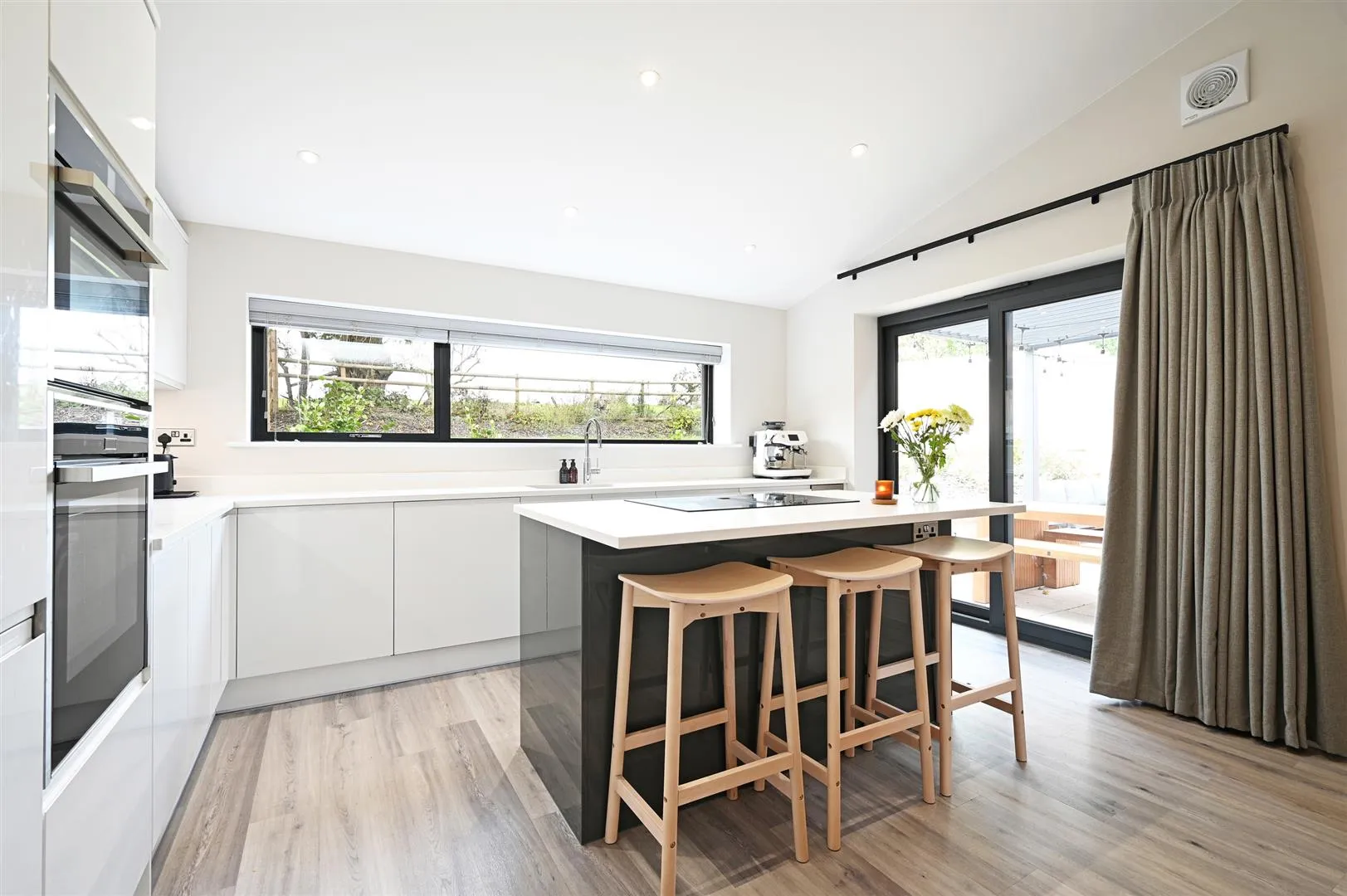 A well-appointed dining kitchen having a rear facing aluminium double glazed panel, pendant light points, recessed lighting, deep skirtings and timber flooring with under floor heating. There are a range of fitted base/wall and drawer units incorporating a work surface, upstands, under-counter lighting and an inset 1.5 bowl stainless steel sink with a chrome mixer Quooker tap. Appliances include a Neff full-height fridge freezer, Neff dishwasher and two Neff oven/grills. There is a separate central island with a matching work surface that has an in-built Neff four-ring induction hob with a suction extractor. A timber door opens to the storage cupboard.
