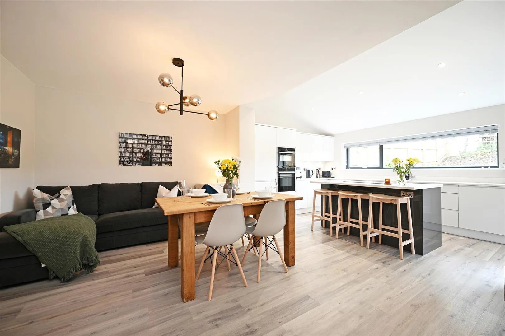 A light-filled lounge with a front facing aluminium double glazed panel, pendant light points, TV/aerial point and under floor heating. An opening gives access to the dining kitchen and aluminium bi-fold doors open to the rear of the property.