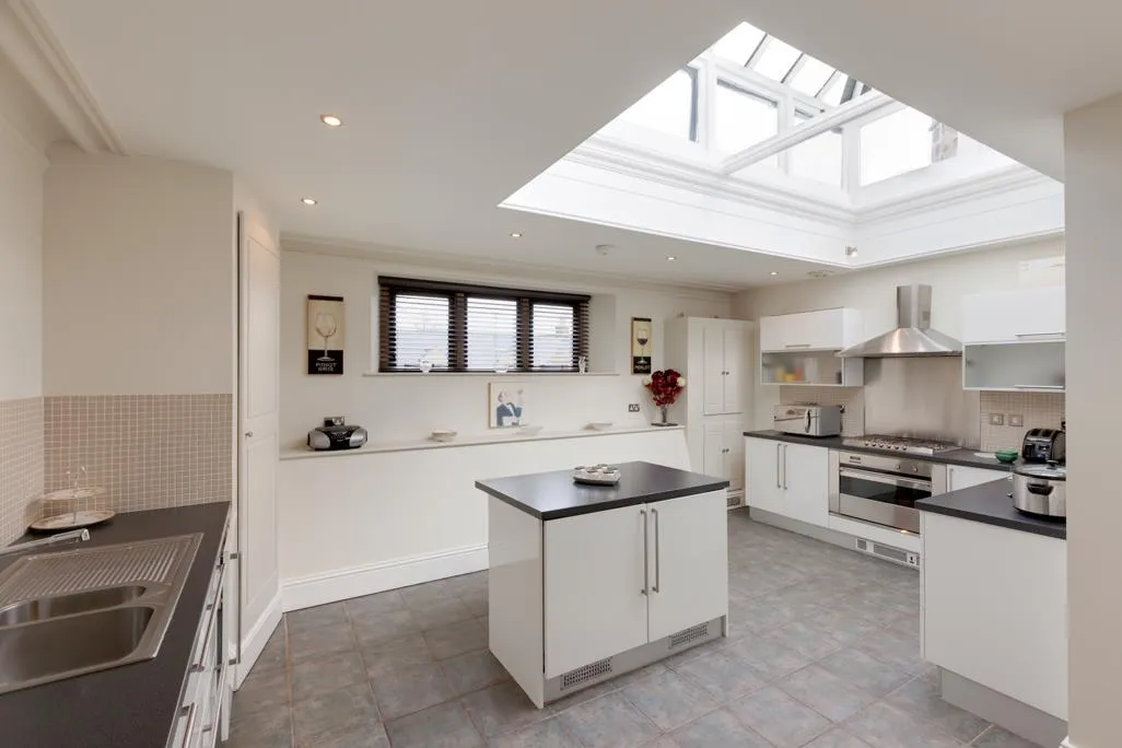 A bright space with rear facing aluminium double glazed windows and a timber glazed roof lantern with feature lighting. Having recessed lighting, telephone point, TV/aerial point and tiled flooring. Two separate built-in cupboards house the Viessmann boiler and hot water cylinder. There’s a range of fitted base/wall and drawer units, incorporating matching work surfaces, tiled splash backs, plinth heaters and an inset 1.5 bowl stainless steel sink with a chrome mixer tap. Also having a central island with a matching work surface, which provides breakfast seating for two chairs. Appliances include a Smeg four-ring gas hob with a wok burner and a Salter extractor hood above, a Smeg fan assisted oven and a Smeg dishwasher. The central island houses the under-counter fridge and under-counter freezer. There is space/provision for an automatic washing machine. Timber doors open to the lounge and hallway.