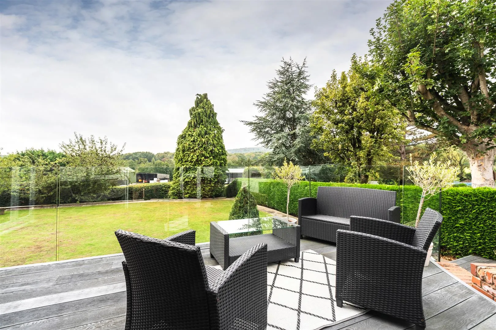 The path that wraps around the garden continues to a raised decked seating terrace with glazed balustrading overlooking the rear, and the outdoor kitchen.