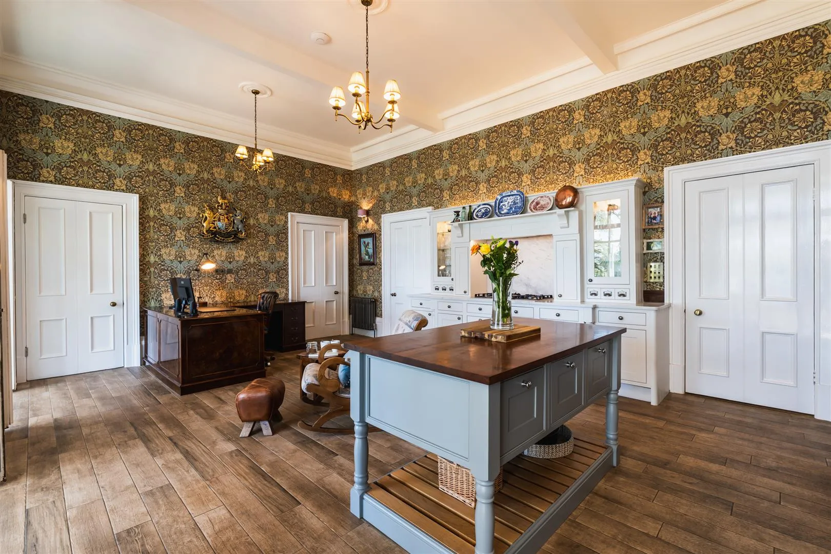 Having a ceiling with decorative mouldings and coving, pendant light point with a decorative ceiling rose, picture rail, dado rail, deep skirtings and tiled flooring. Double timber doors open to the pantry and a timber door also opens to the utility room/WC.