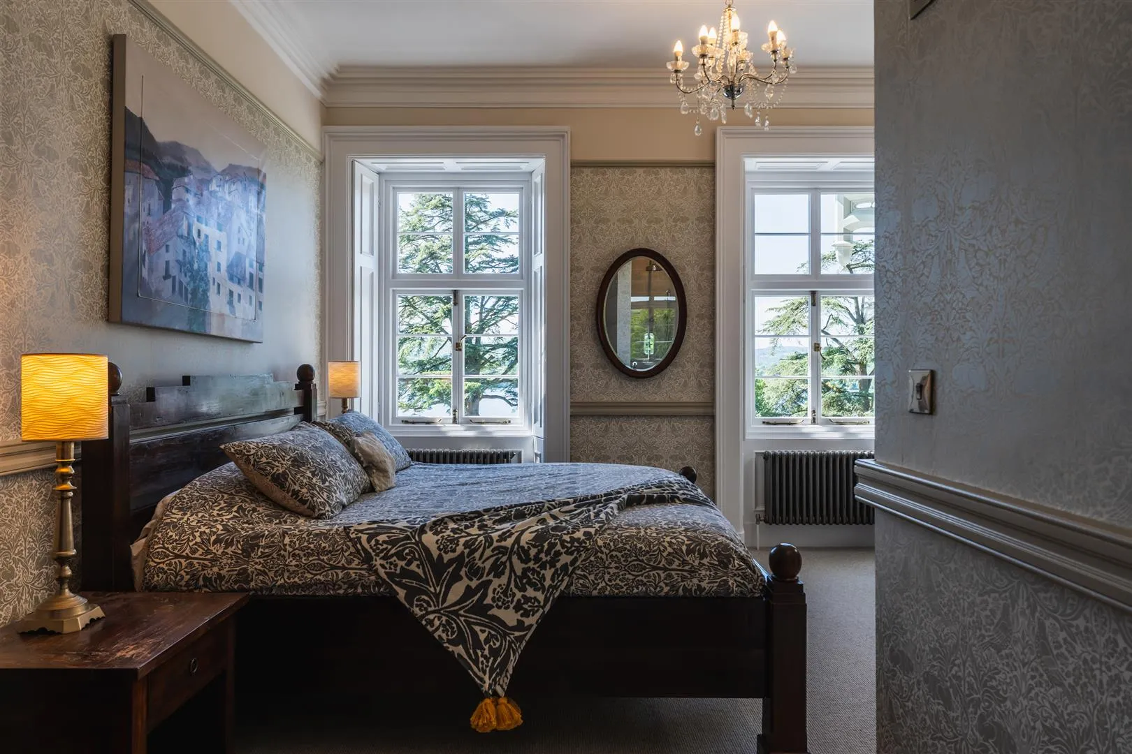 A fabulous bedroom suite with views over the lake and front facing timber double glazed windows with fitted shutters, coved ceiling, pendant light point, picture rail, dado rail, central heating radiators, TV/aerial cabling and deep skirtings. A fully tiled alcove with recessed lighting, an extractor fan and a chrome heated towel rail houses a shower enclosure with a fitted rain head shower, an additional hand shower facility and a glazed screen/door. A timber door also opens to the bedroom 2 en-suite.