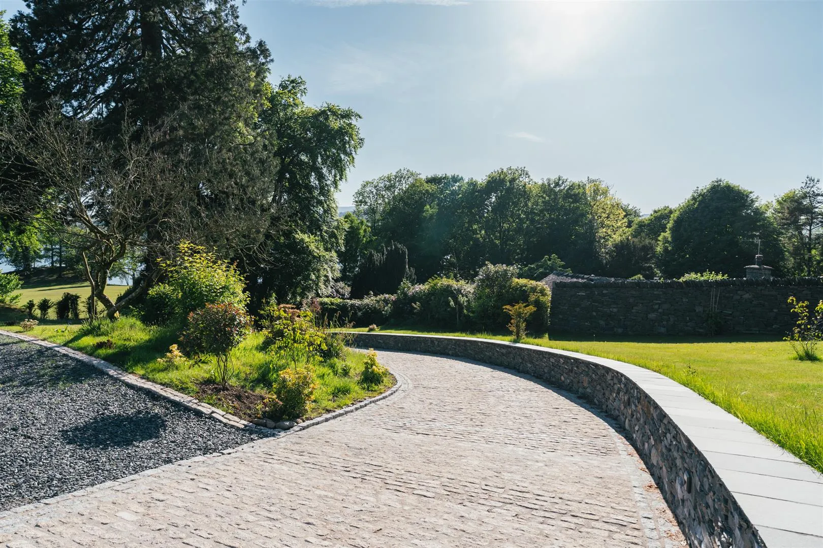 From the road, wrought iron electric gates and a separate pedestrian gate set between two stone pillars open to Wansfell Holme. A sweeping cobblestone driveway bordered to one side by a dry stone wall with exterior lighting leads up to the property.