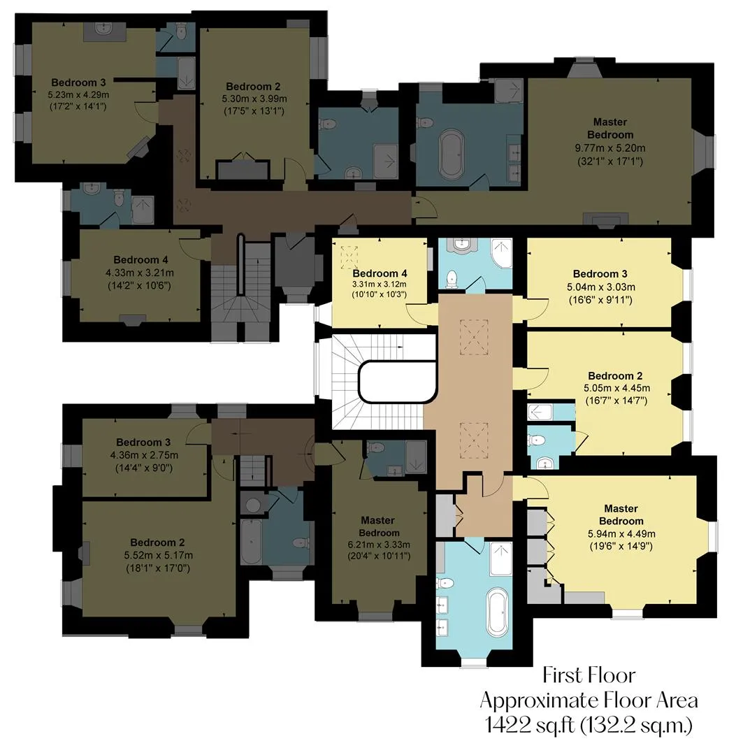 On the first floor: Landing, master hallway, master en-suite bathroom, master bedroom, bedroom 2, bedroom 2 en-suite, bedroom 3, family shower room and bedroom 4.