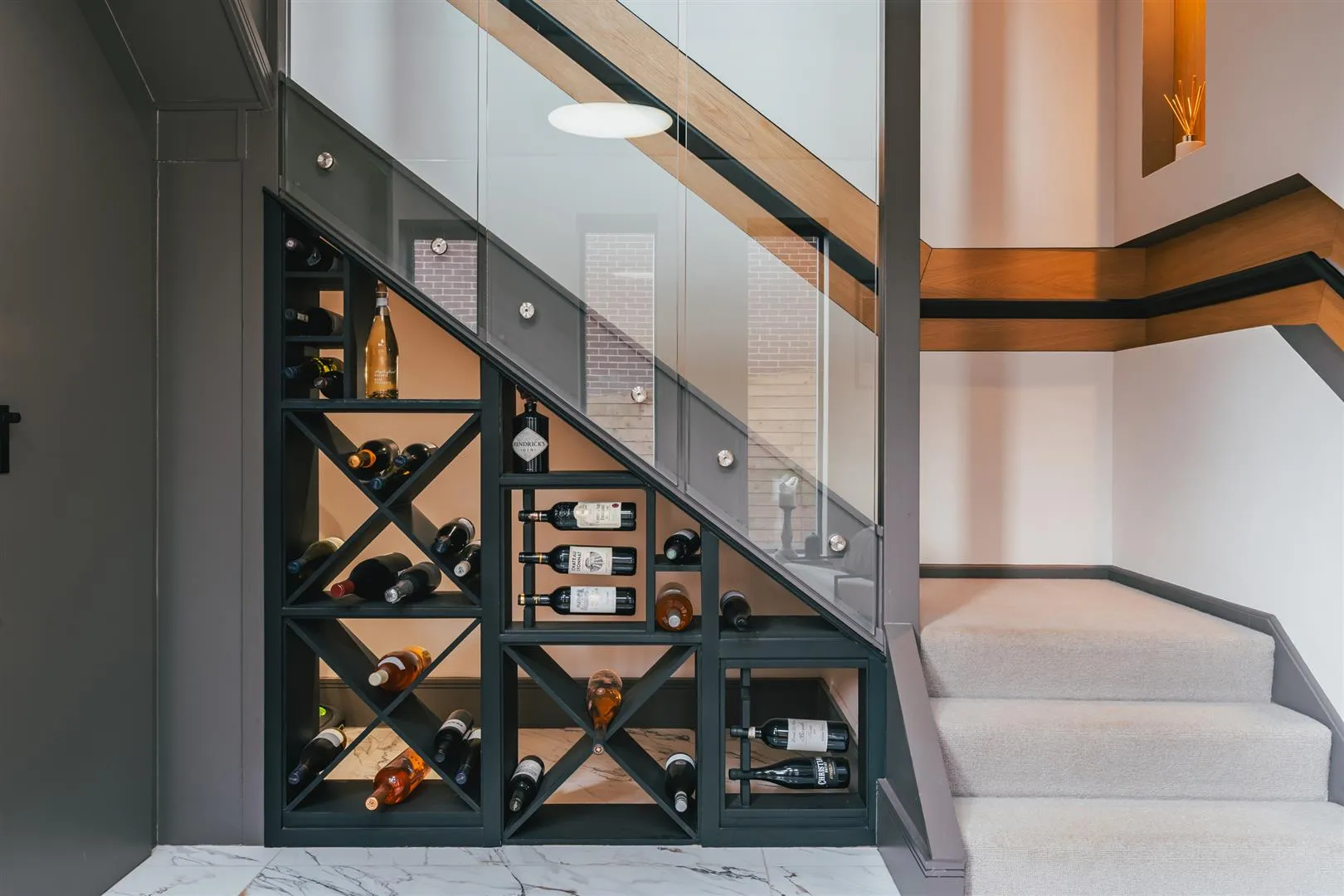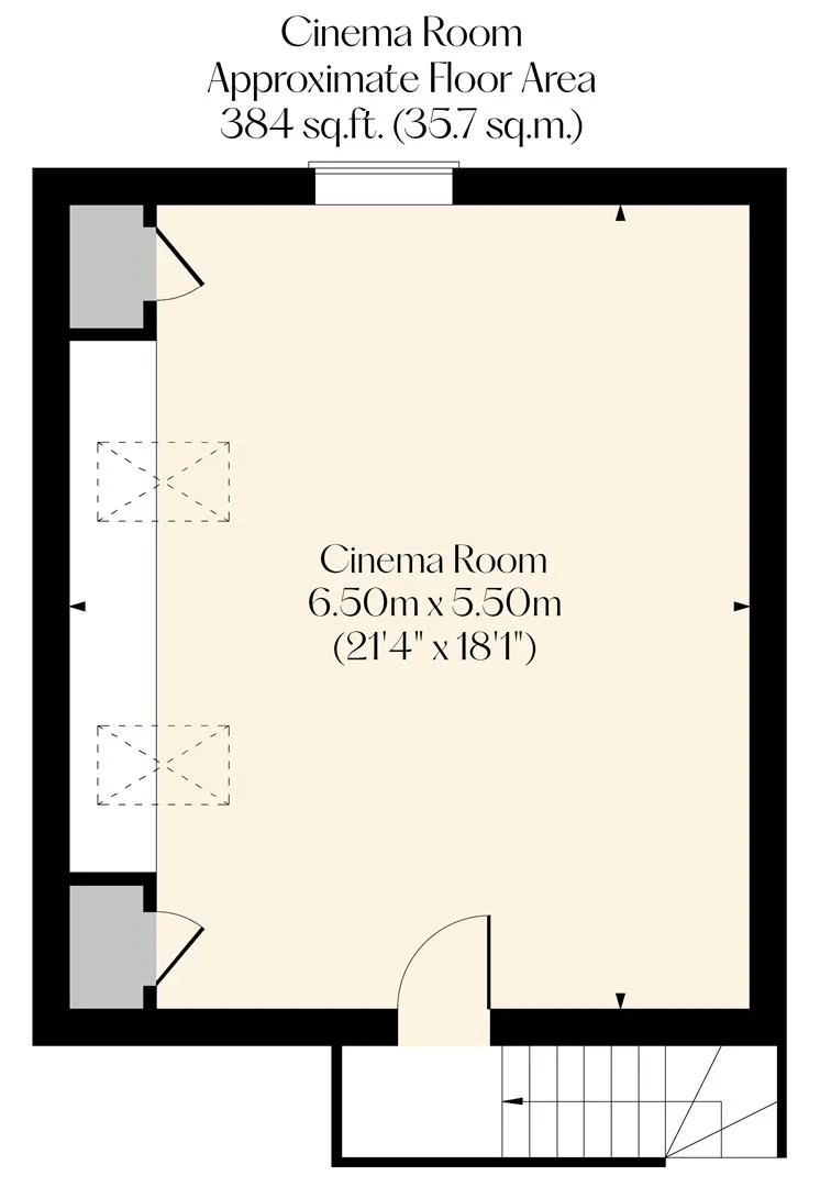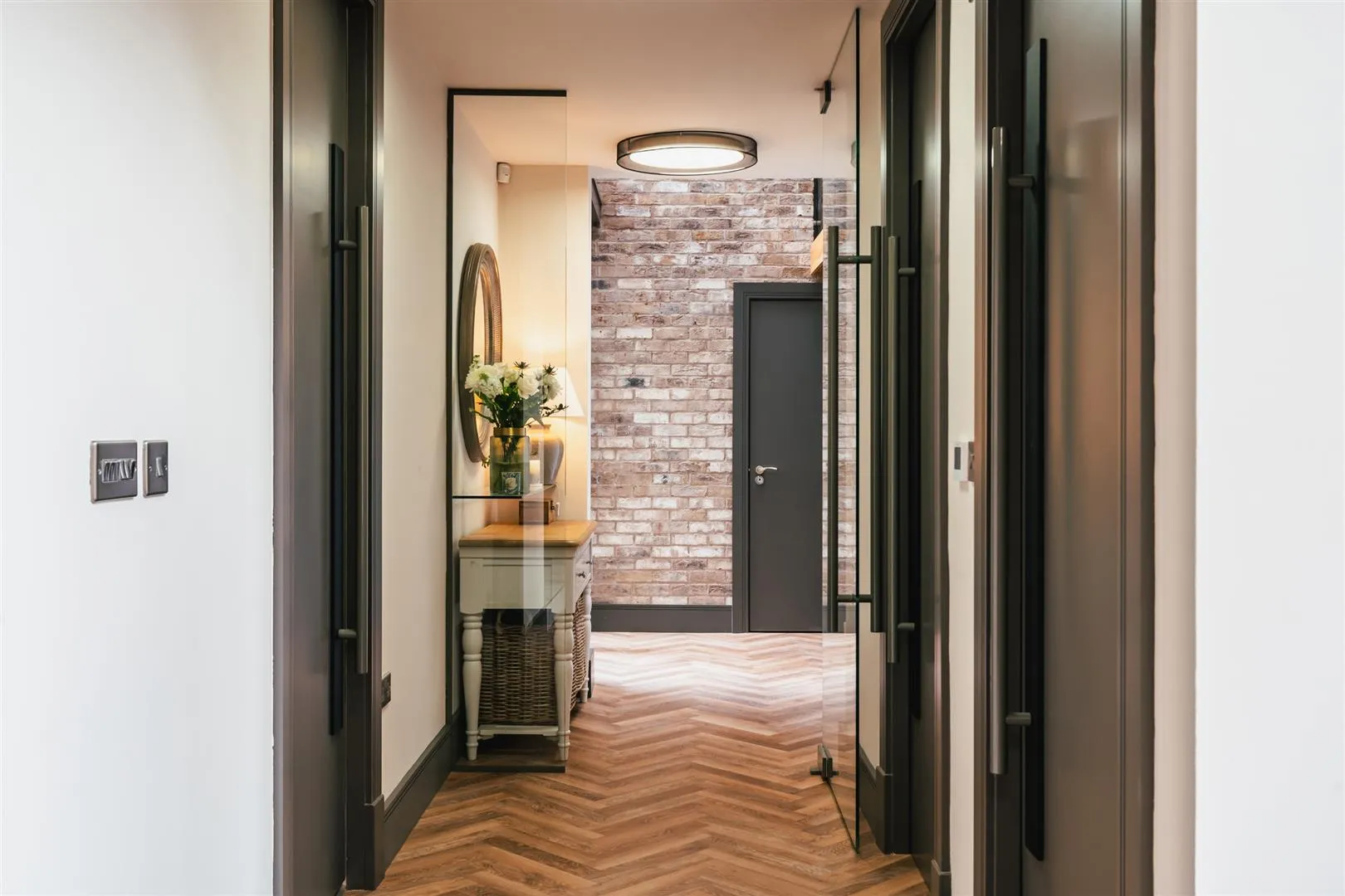 From the entrance hall, a floating oak staircase with glazed balustrading, an exposed brick wall and wall mounted light points rises to a timber door, which opens to the cinema room.