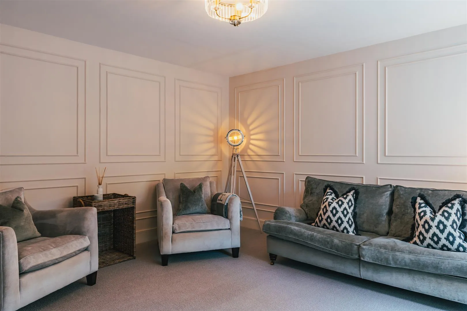 The central hub of the home is undoubtedly the living kitchen, which enjoys a free flowing, open plan layout for cooking, dining and relaxing, and is filled with natural light. The kitchen itself is extremely well-appointed, incorporating quartz work surfaces, a comprehensive range of high-quality integrated appliances and a U-shaped central island with ample space for seating. Three further reception rooms provide generously proportioned spaces to unwind or work from home, with a useful study off of the living kitchen and a superb cinema room above the garage.