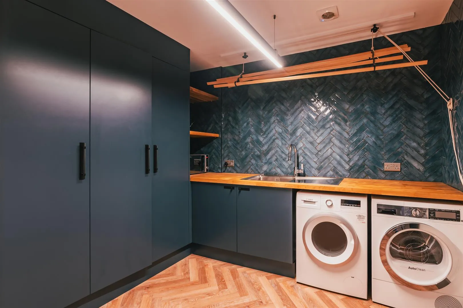 Having a pendant light point, an extractor fan and Karndean herringbone flooring with under floor heating. There is a range of fitted base and wall units, incorporating an oak work surface, full-height tiled splash backs and an inset 1.0 bowl stainless steel sink with a Grohe chrome mixer tap. A cupboard houses the fuse box and data/aerial ports. There is space/provision for a washing machine and a tumble dryer.