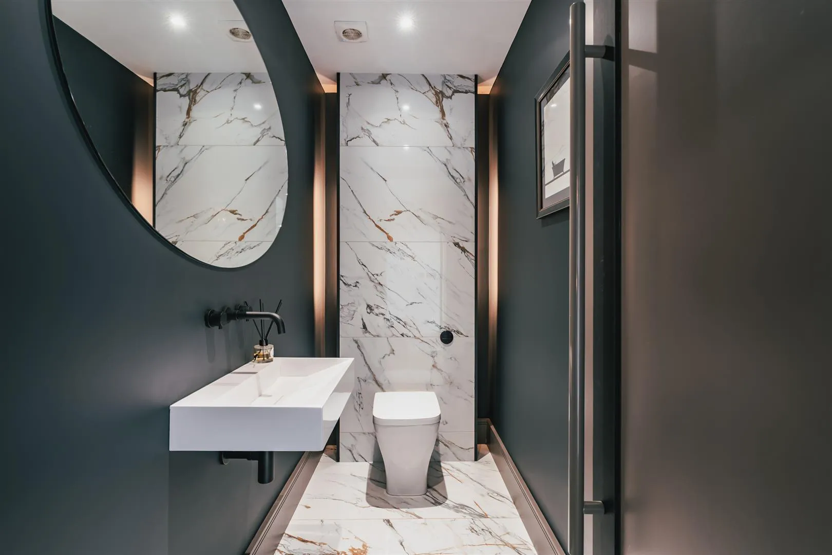 Having recessed lighting, an extractor fan, LED lighting and tiled flooring with under floor heating. There is a suite in white, which comprises a low-level WC and a wall mounted wash hand basin with a black mixer tap.