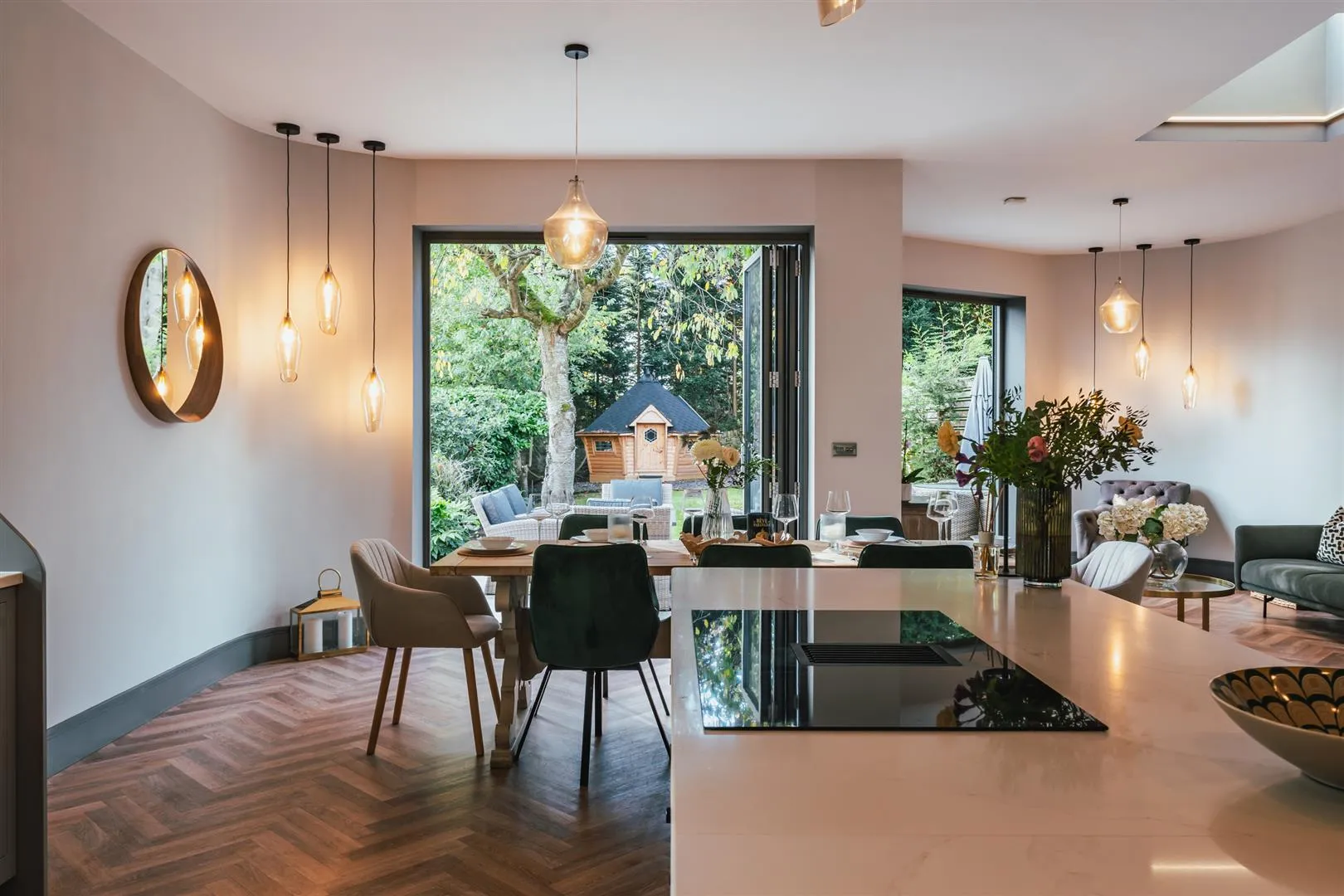 A stunning dining kitchen, finished to a high-quality. Having a side facing powder coated aluminium double glazed panel, pendant light points, recessed lighting, wall mounted light points, TV/aerial/data points and Karndean herringbone flooring with under floor heating. There is a range of fitted base and wall units, incorporating a quartz work surface, splash backs and an inset 1.0 bowl stainless steel with a Quooker chrome mixer tap. A Butlers pantry contains fitted shelving and drawers. The focal point of the kitchen is the central island that provides additional storage with matching quartz work surfaces and a breakfast bar that allows space for six stools. Appliances include a Smeg induction hob with a built-in extractor, two Siemens fan assisted ovens, a Siemens dishwasher, a CDA wine cooler, a full-height fridge and a full-height freezer. Bi-folding powder coated aluminium doors with double glazed panels open to the rear of the property. Wide openings lead into the living area and study.