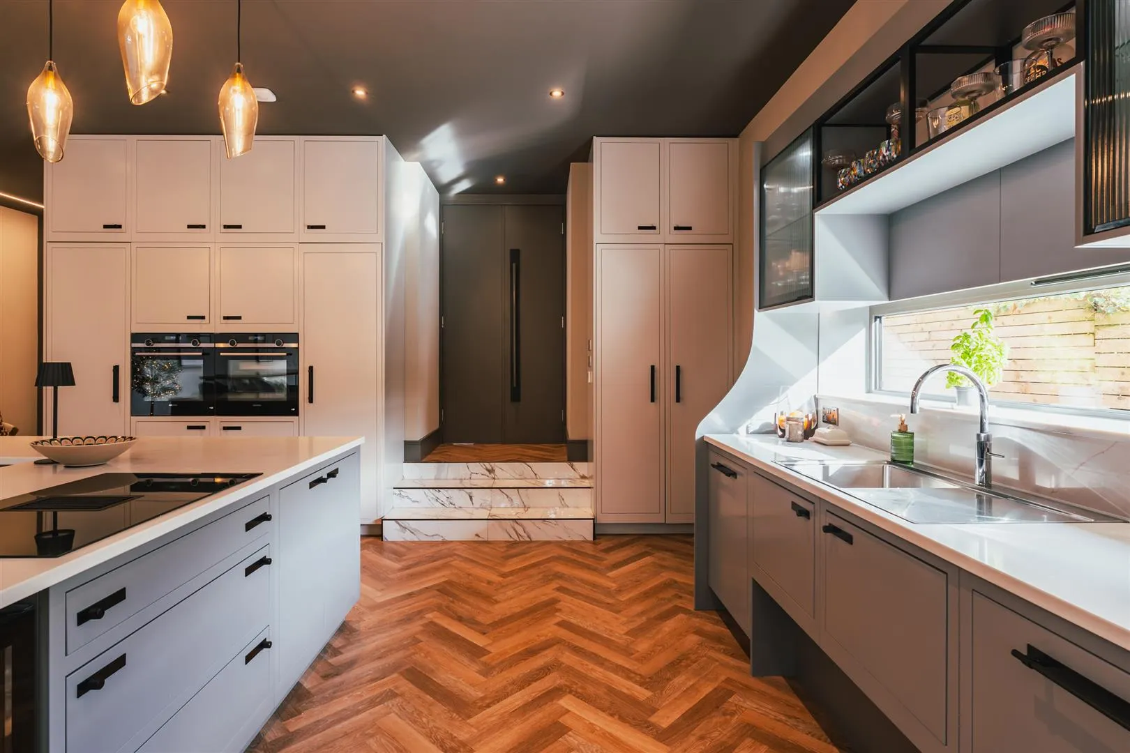 Connecting the primary areas of the home, the inner hall has side facing powder coated aluminium double glazed panels, flush light points, wall mounted light points and Karndean herringbone flooring with under floor heating. A raised platform with tiled flooring incorporates fitted furniture set beneath the staircase with wine racks and shelving. Within the furniture is a useful storage cupboard. Timber doors open to the lounge, utility room and WC. Double timber doors open to the living kitchen.