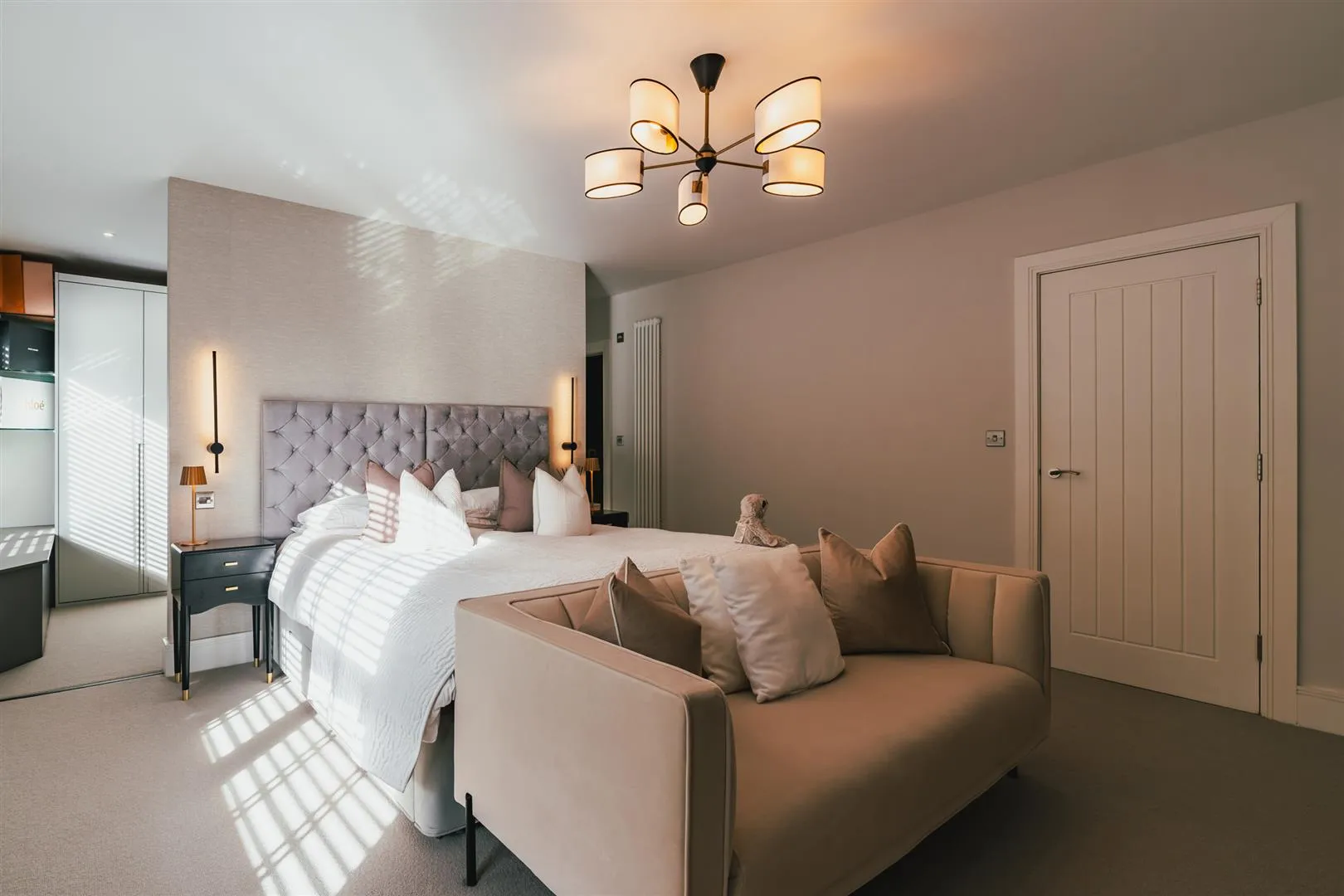 A luxurious bedroom suite comprising a rear facing powder coated aluminium double glazed window, pendant light point, central heating radiator, TV/aerial/data points and Virgin Media Ethernet ports. Two openings lead into the master dressing room.