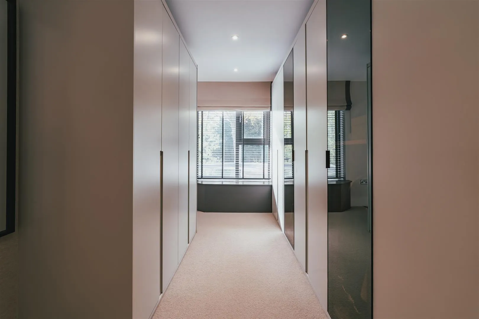 Fabulously appointed with an extensive range of storage, the dressing room has a rear facing powder coated aluminium double glazed window, recessed lighting and a central heating radiator. There is a range of fitted furniture, incorporating short/long hanging, shelving and drawers. A sliding pocket door opens to the master en-suite shower room.
