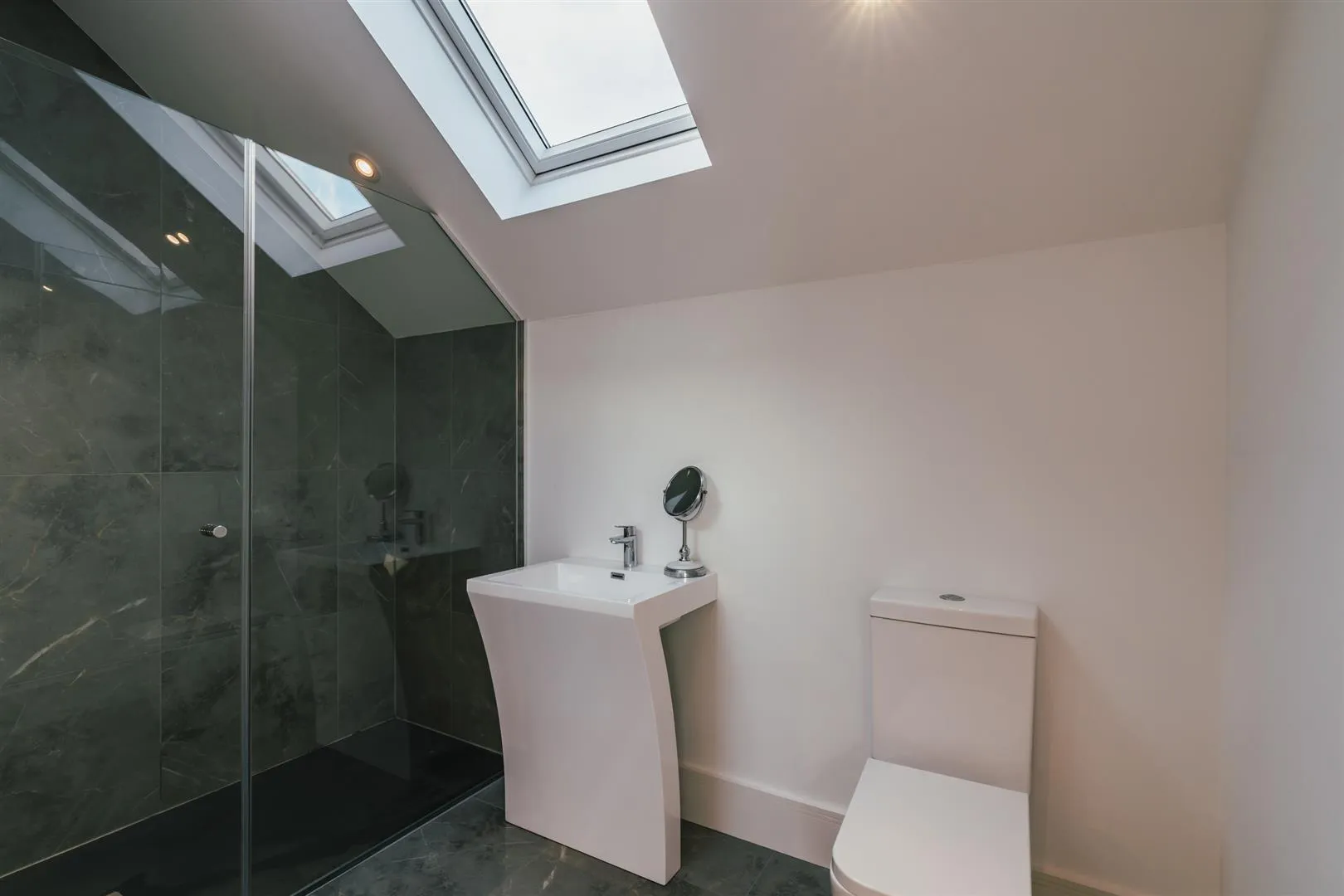 Having a Velux roof window, recessed lighting, extractor fan, chrome heated towel rail and tiled flooring with under floor heating. There is a suite in white, which comprises a low-level WC and a wall mounted wash hand basin with a chrome mixer tap. To one wall is a shower enclosure with a fitted rain head shower, an additional hand shower facility and a glazed screen/door.