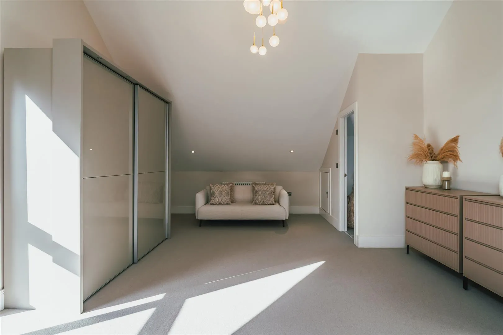 Having a rear facing powder coated aluminium double glazed window, Velux roof window with a fitted blind, pendant light point, recessed lighting, central heating radiator, TV/aerial/data points and Virgin Media Ethernet ports. Timber doors open to the bedroom 3 en-suite shower room and eaves storage.