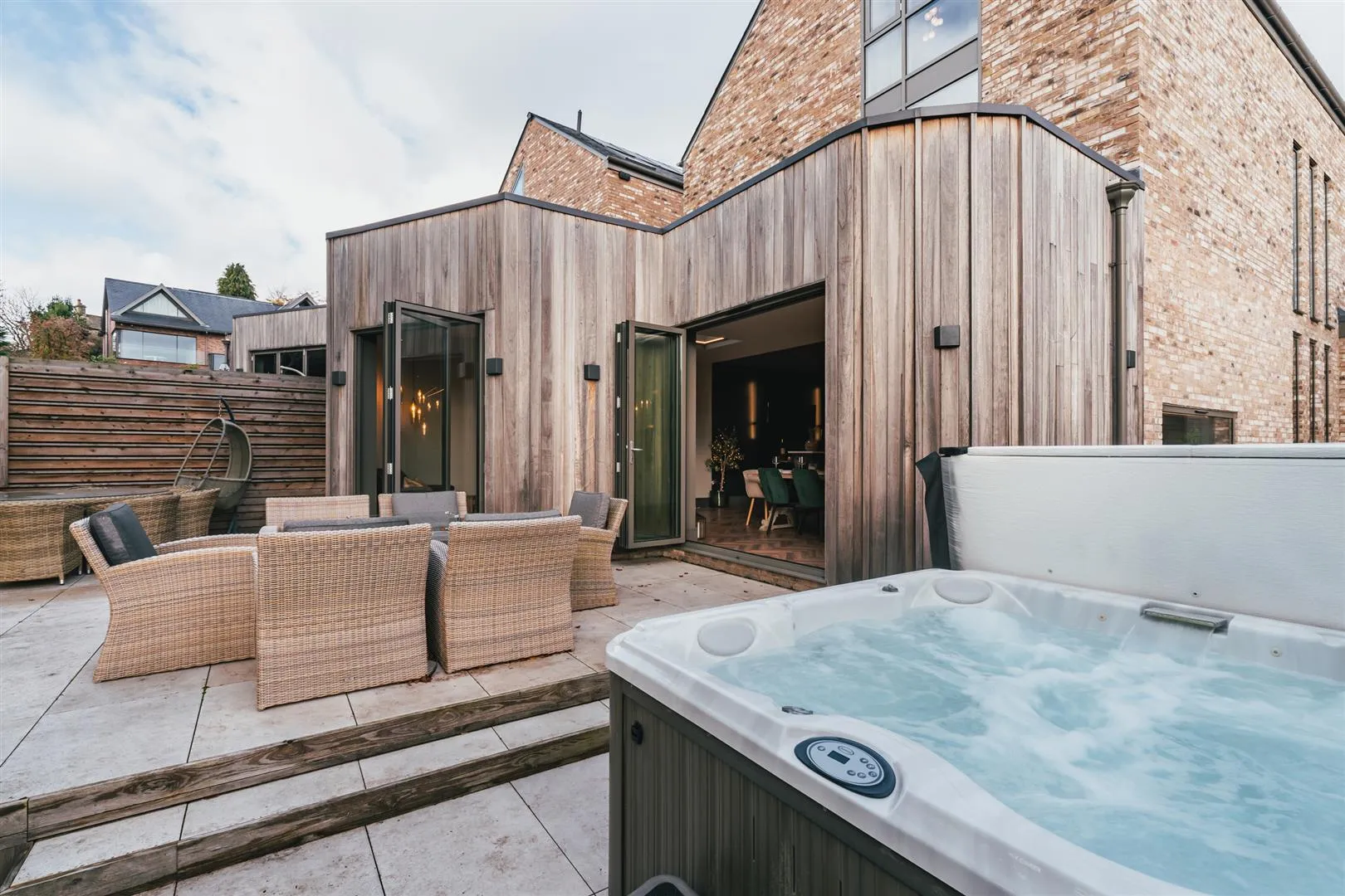 To the rear is a two-tier stone flagged seating terrace with exterior lighting, an external power point and provision for a hot tub. Access can be gained to the living kitchen and a slate chipping path leads down the left hand side of the property, where there is exterior lighting, an external power point, a water tap and a planted border containing bamboo and shrubs.