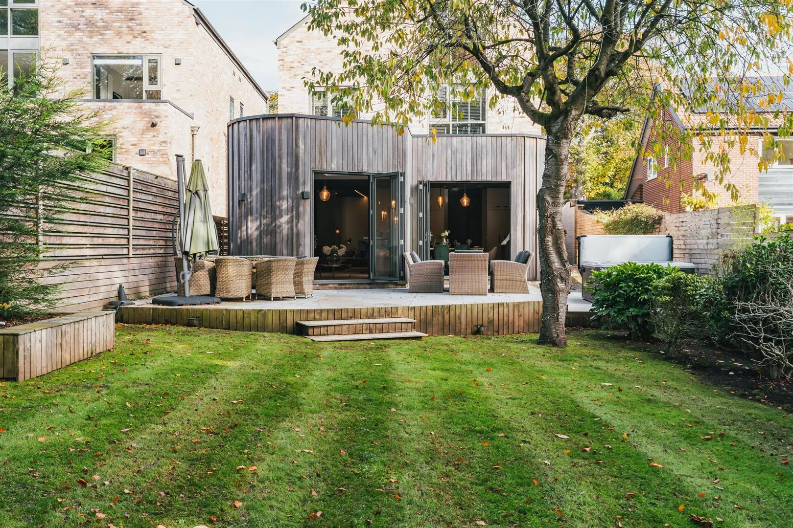 Arranged across the first and second floors, five double bedrooms provide plenty of room for a growing family. Mezzanine landings and a staircase with modern glass balustrades and illuminated hand rails connect each floor. A sumptuous master bedroom suite presents a calming retreat overlooking the garden and trees beyond, and contains a fully fitted dressing room and an opulent en-suite shower room with a large walk-in shower. Two other bedrooms have en-suite shower rooms and the family bathroom showcases a freestanding bath.