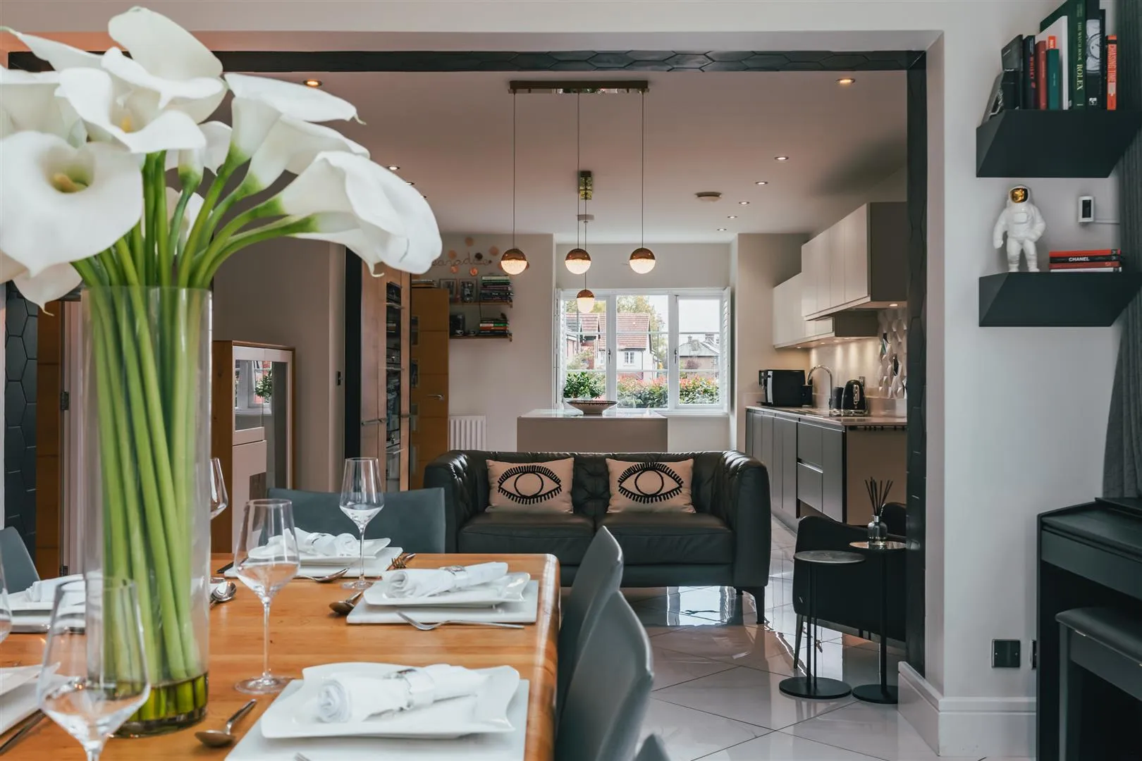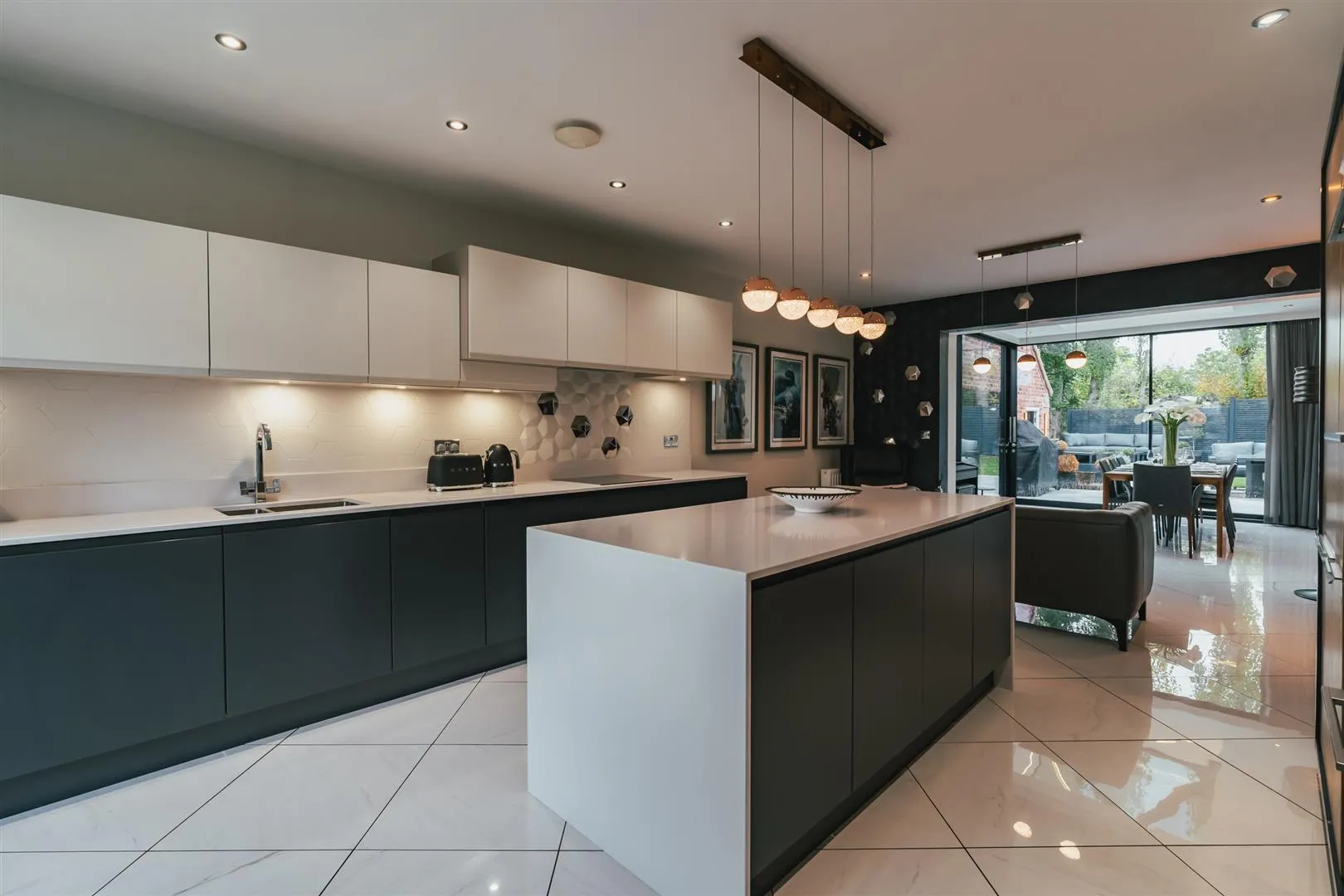 The dining kitchen is the perfect hub for every day life and seamlessly connects to the fabulous orangery, which showcases impressive floor-to-ceiling aluminium sliding doors opening to the garden. Well-appointed with a range of Siemens appliances, the dining kitchen provides plenty of storage and has Silestone work surfaces and a central island. Adjacent to the orangery is a superb lounge and there is also a versatile playroom that could be alternatively useful as a study. Five bedrooms occupy the first floor, including the luxurious master bedroom suite with a Juliet balcony and a sleek en-suite shower room. Another of the bedrooms has the benefit of an en-suite, and there is a contemporary family bathroom.