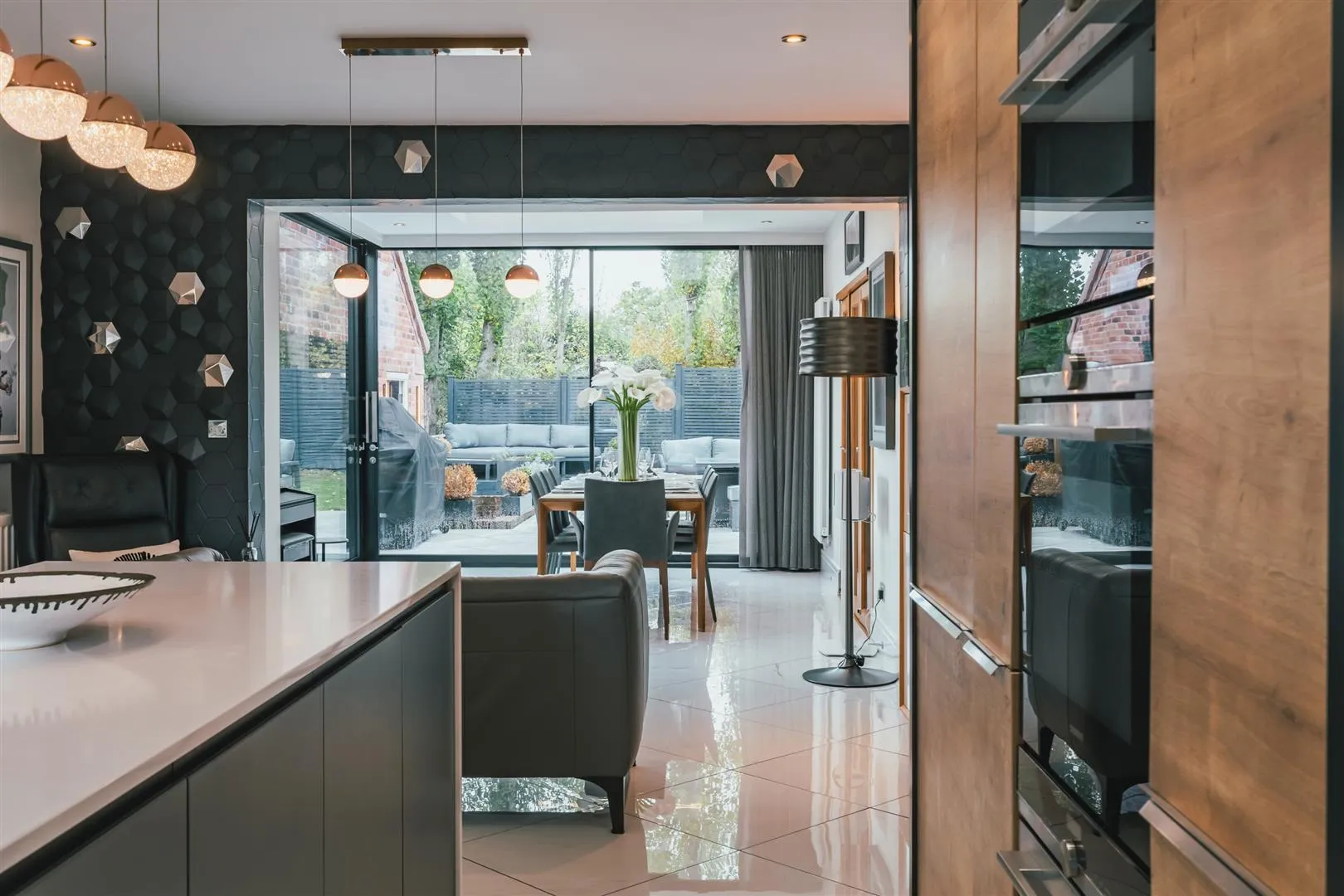 A porcelain flagged path leads to a composite decked terrace and the garden, which is mainly laid to lawn and has mature trees, shrubs and exterior lighting. The garden is fully enclosed by fencing.