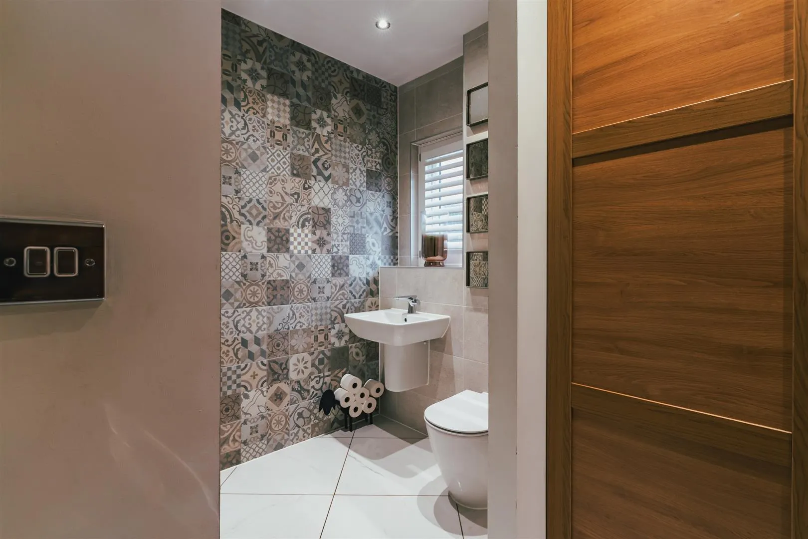 Being fully tiled in Porcelanosa tiles and having a side facing UPVC double glazed obscured window with fitted shutters, recessed lighting, extractor fan, illuminated vanity mirror, chrome heated towel rail and recessed storage with shelving. There is a suite in white, which comprises a wall mounted WC and a wall mounted GD Porcelanosa wash hand basin with a chrome mixer tap and storage beneath. To one wall is a shower enclosure with a fitted Vado rain head shower, an additional hand shower facility and a glazed screen.