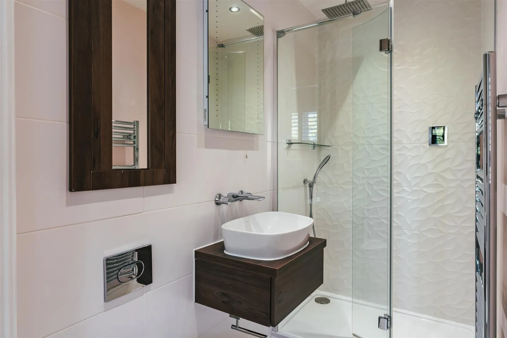 Having recessed lighting, extractor fan, one fully tiled wall in Porcelanosa tiles, illuminated vanity mirror, chrome heated towel rail, recessed storage with shelving and tiled flooring in Porcelanosa tiles. There is a suite in white, which comprises a wall mounted WC and a wall mounted vanity unit, incorporating a Sottini wash hand basin with a chrome mixer tap and storage beneath. To one wall is a fully tiled shower enclosure with a fitted Vado rain head shower, an additional hand shower facility and a glazed screen/door.