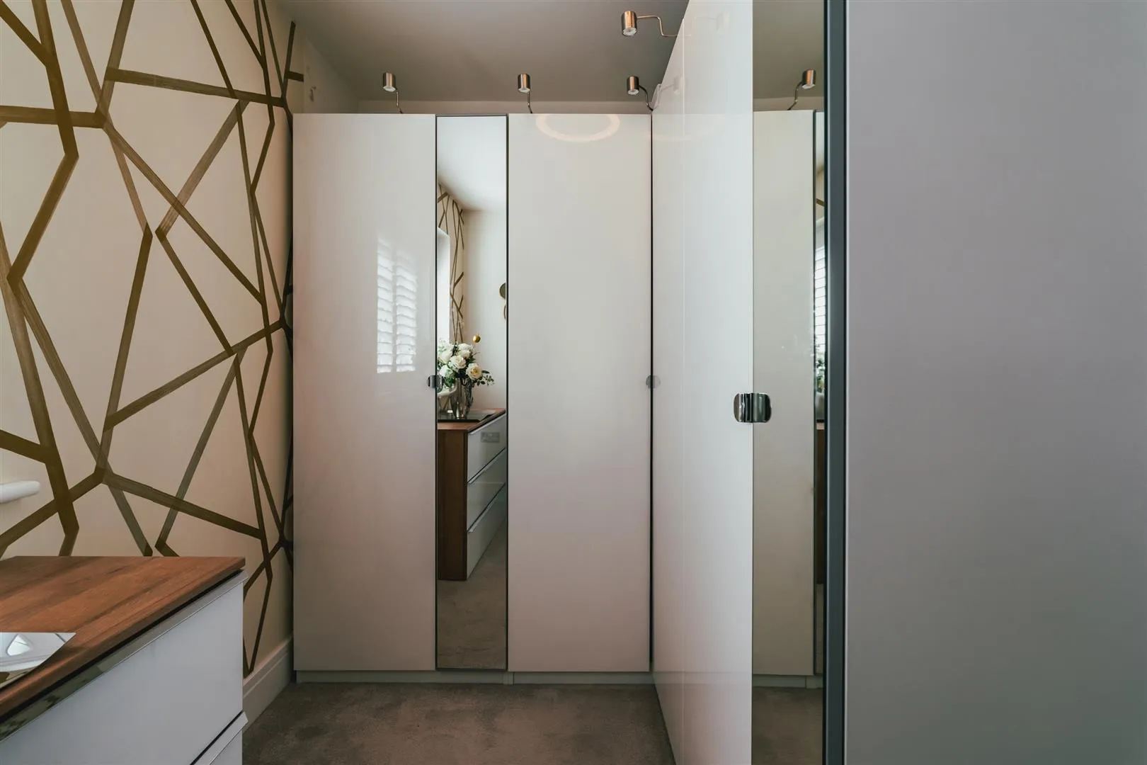 A good-sized double bedroom suite with rear facing UPVC double glazed windows with fitted shutters, flush light point and a central heating radiator. There is a range of fitted furniture, incorporating long hanging and shelving. A timber door opens to the bedroom 2 en-suite shower room.