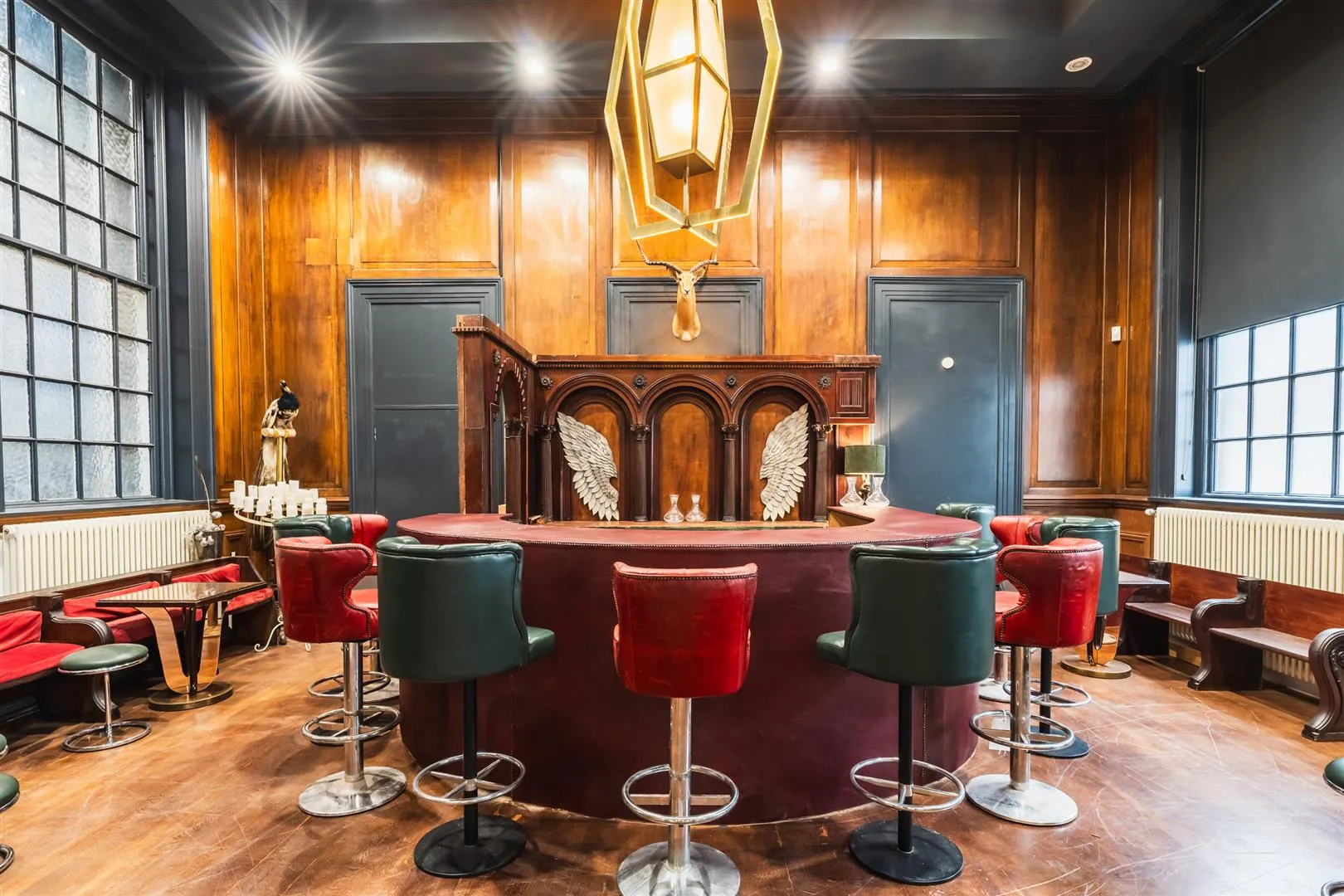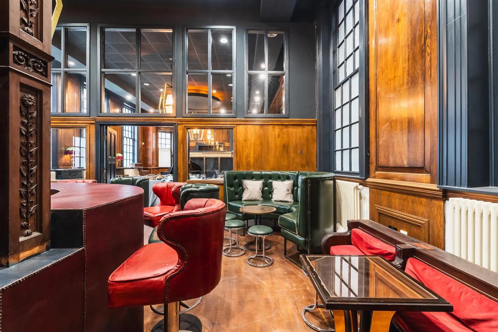 Offering excellent versatility, this impressively grand space features high ceilings, side facing glazed sash windows and front facing curved glazed windows. Also having two feature pendant light points, recessed lighting, oak panelling to the walls, central heating radiators, data points and oak flooring. Double timber doors with glazed panels above open to the bar and a wide opening leads into the diner.