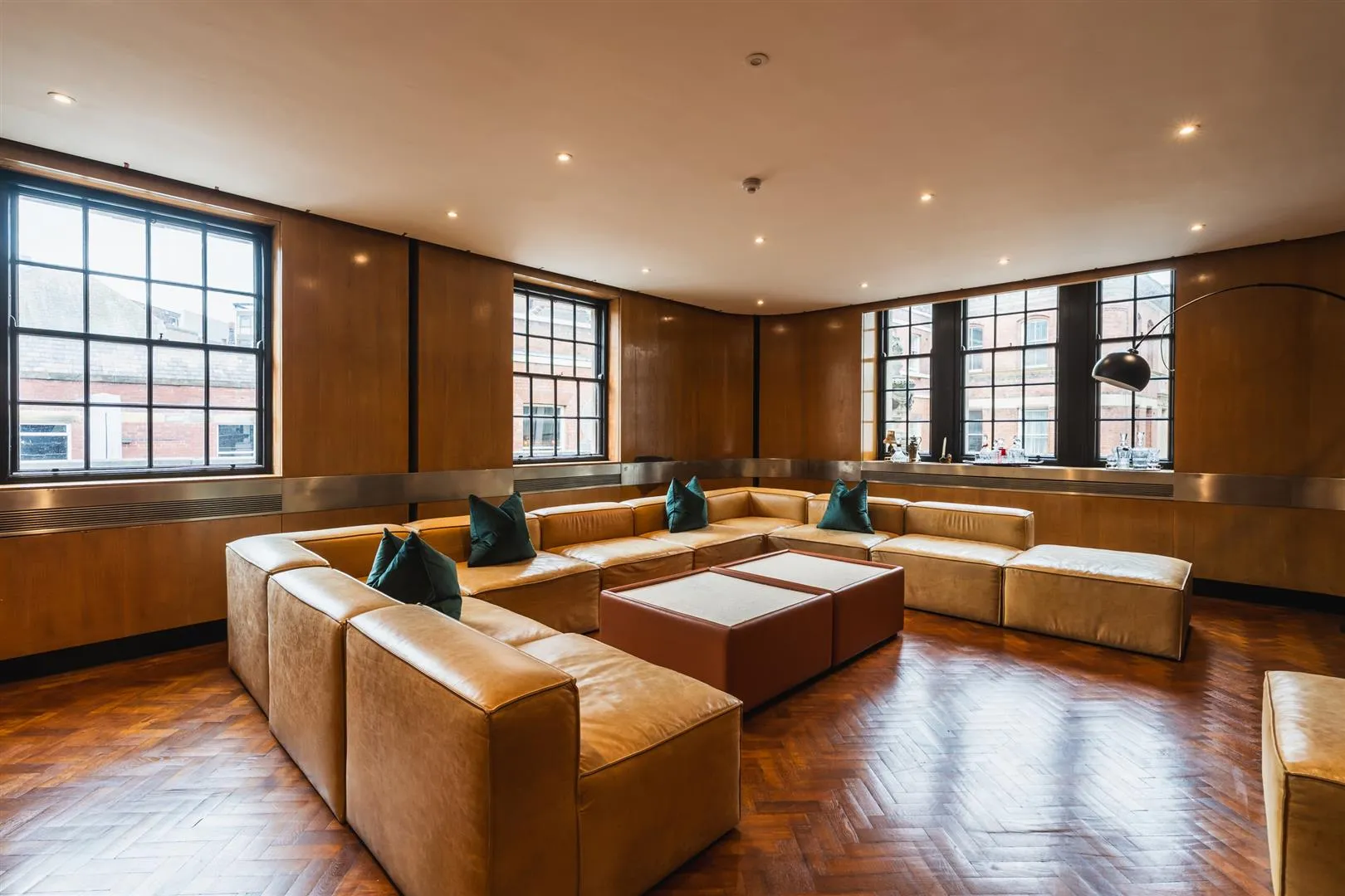 An exceptionally spacious reception room with dual aspect front and side facing timber glazed sash windows, recessed lighting, concealed central heating radiators and herringbone parquet flooring.