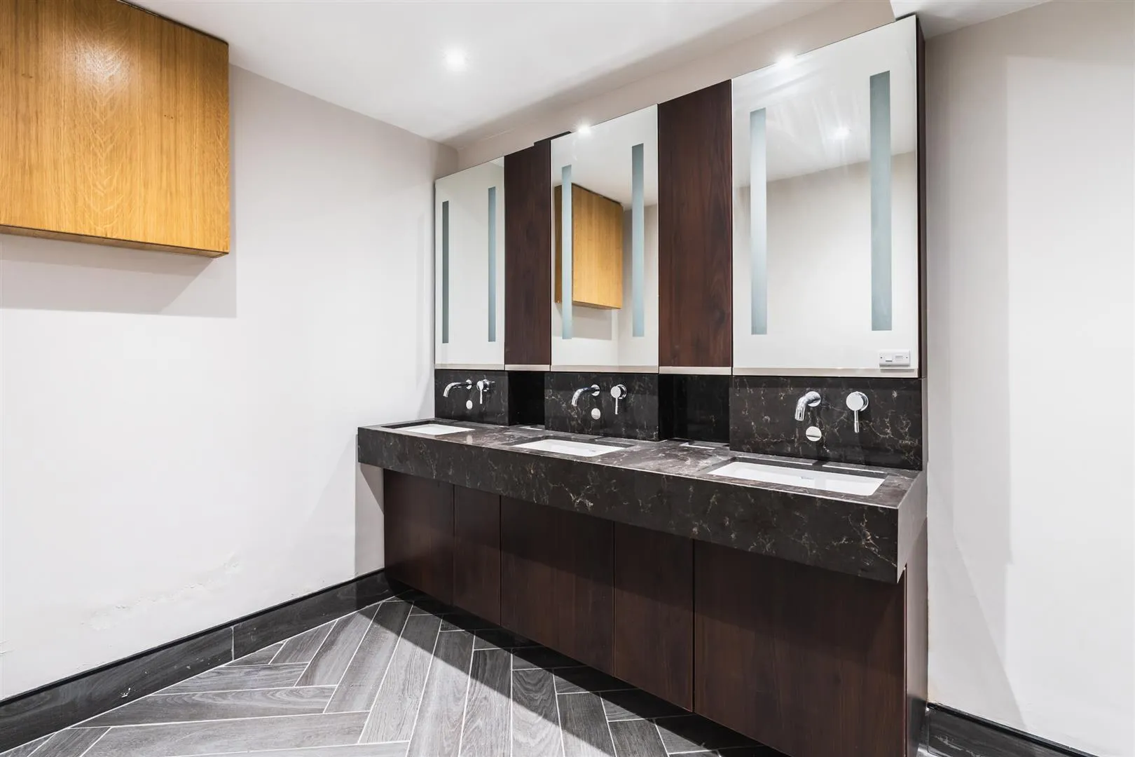 Having recessed lighting, an extractor fan and tiled flooring. There are three inset Duravit wash hand basins with chrome mixer taps, illuminated vanity mirrors above and storage beneath. Timber doors open to cubicles 1 and 2.