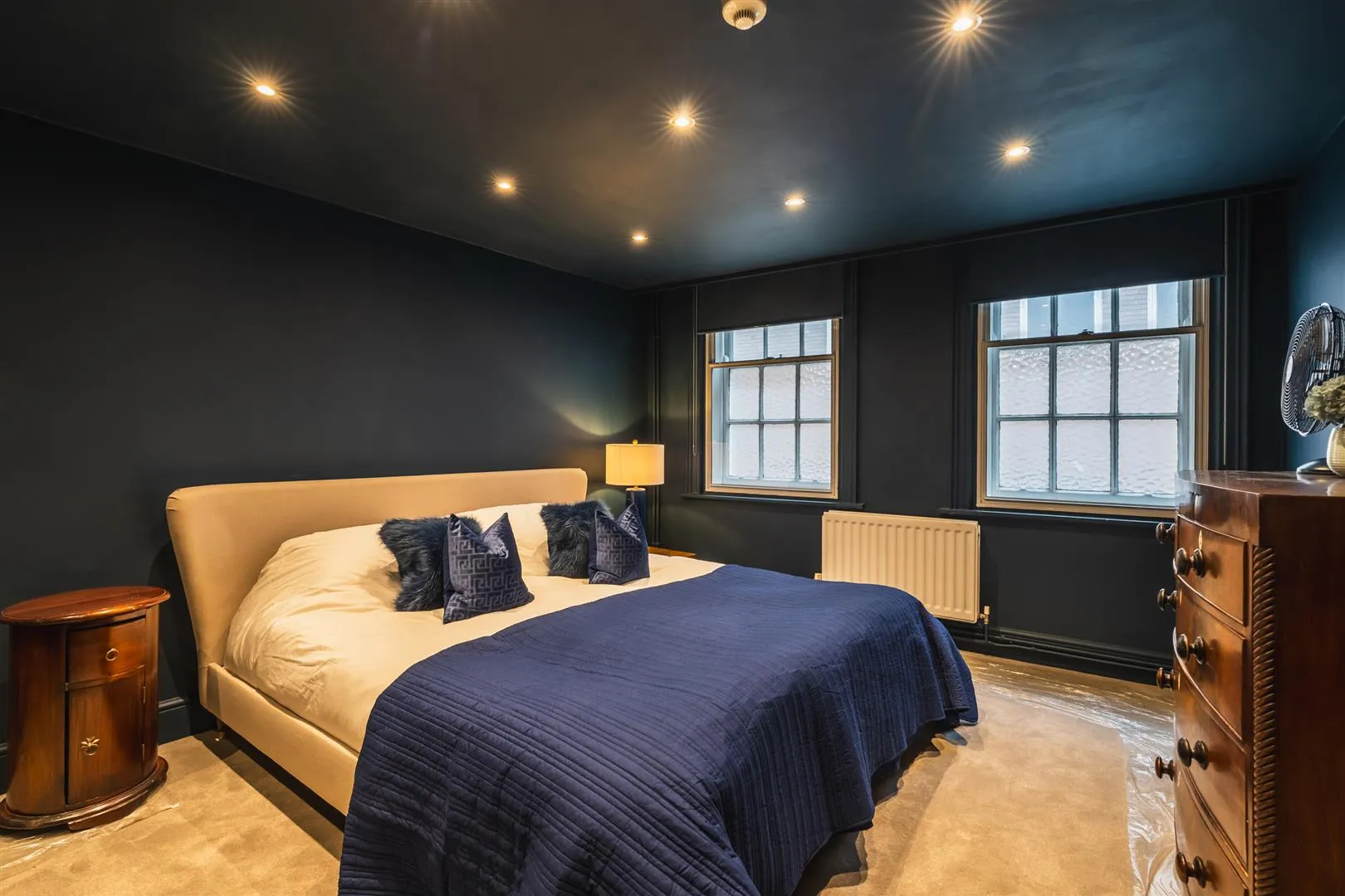 Another double bedroom with side facing timber obscured glazed sash windows with secondary glazing, recessed lighting and a central heating radiator.