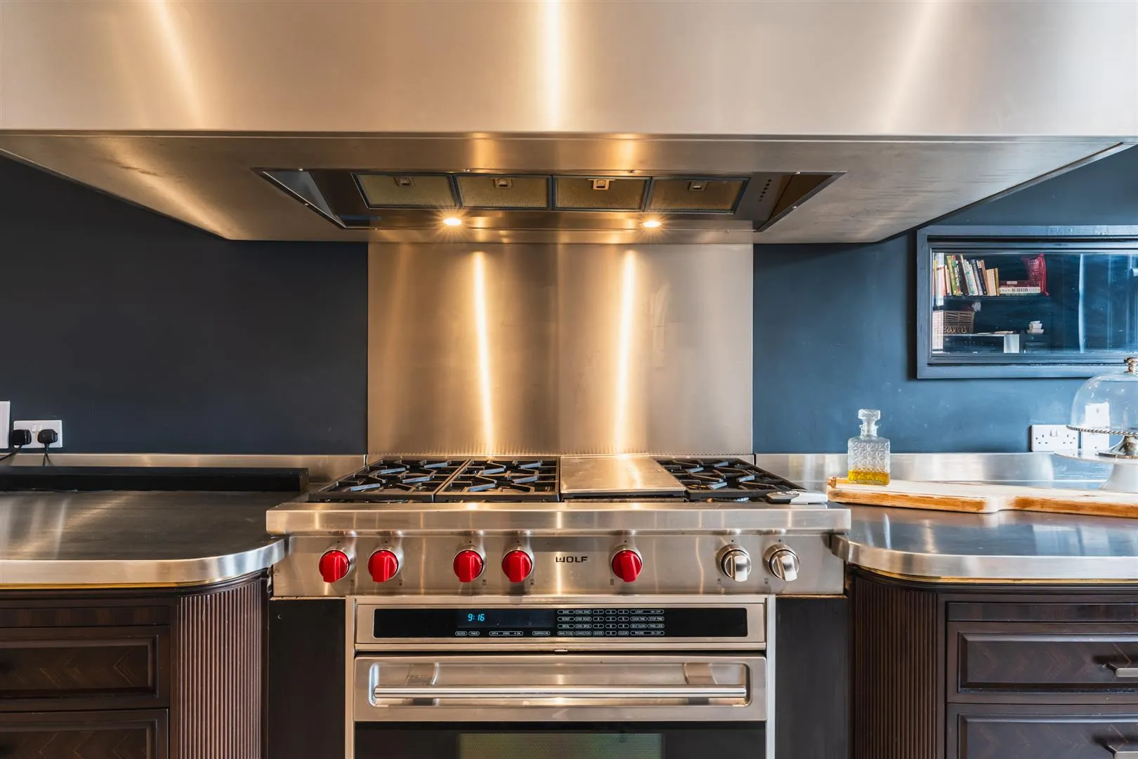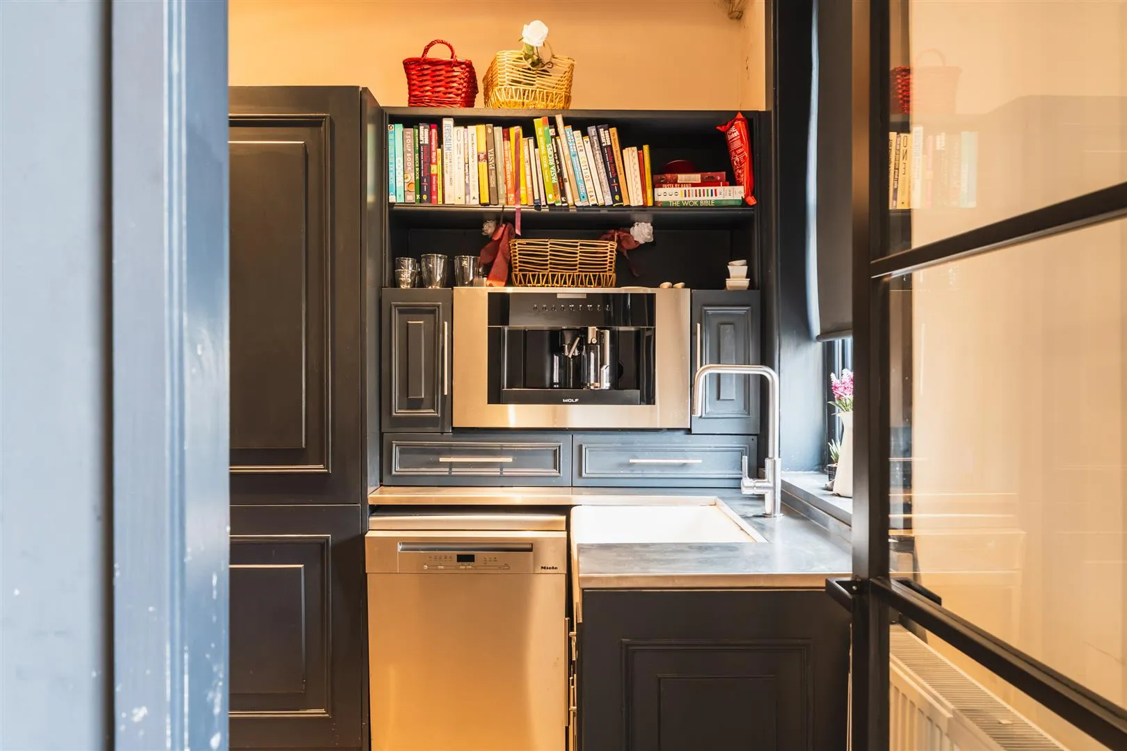 A useful and well-equipped second kitchen with a side facing timber glazed sash window, recessed lighting, extractor fan, central heating radiator and tiled flooring. There is a range of fitted base/wall and shelving units, incorporating a stainless steel work surface and a double width Shaws Classic sink with a chrome mixer tap. There is an integrated Wolf coffee machine, a Wolf oven, full-height Miele fridge and a full-height Gaggenau freezer. There is space for a dishwasher.