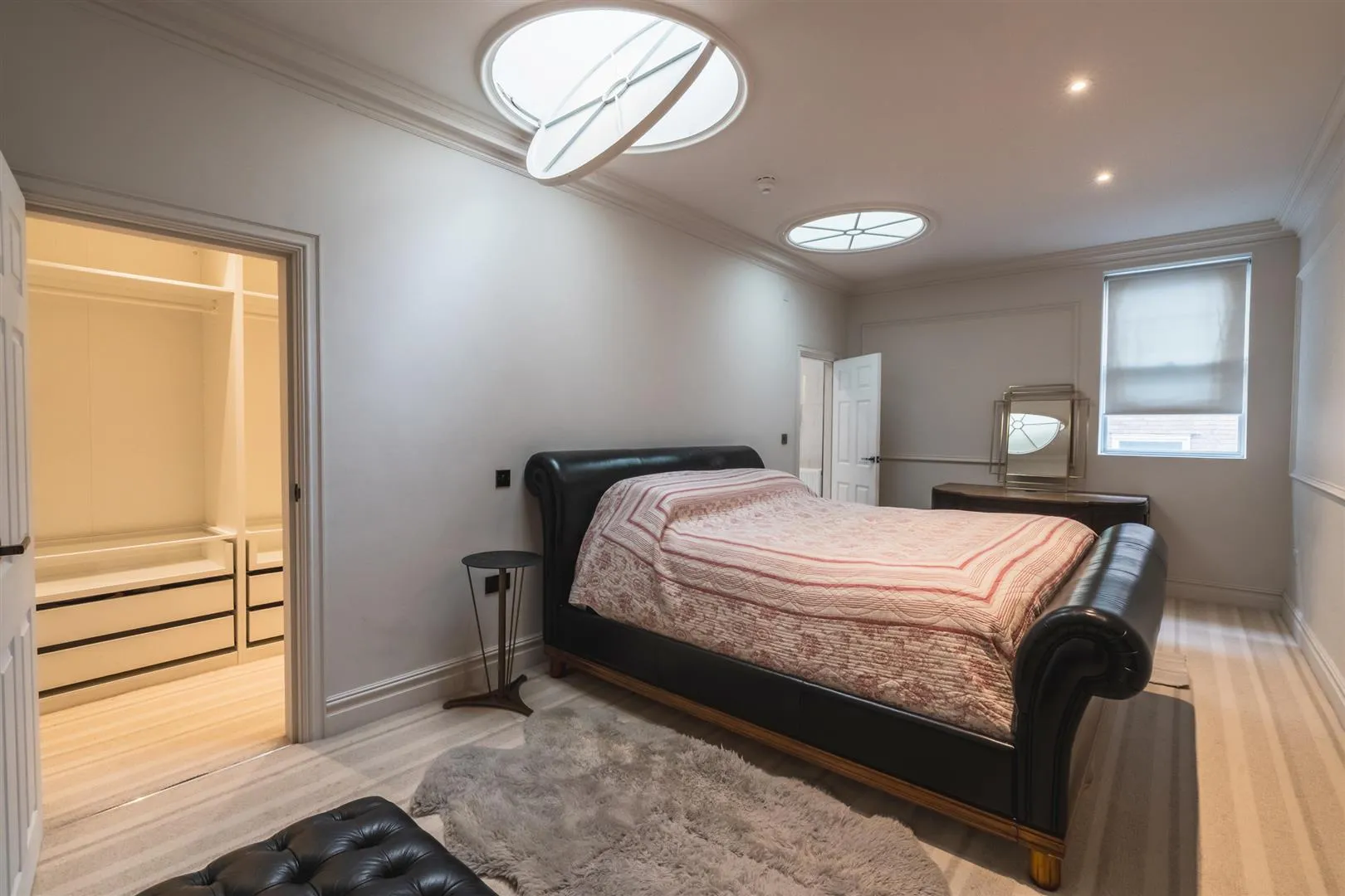 A superb bedroom suite with an opening skylight, recessed lighting and a central heating radiator. A timber door opens to the bedroom 2 en-suite bathroom and bedroom 2 walk-in wardrobe.