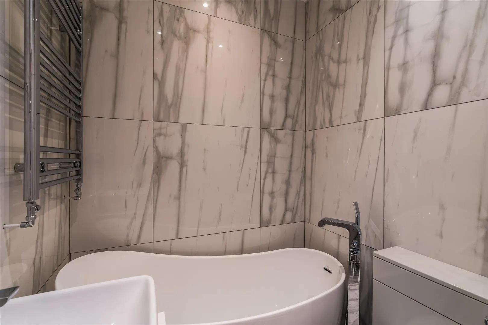 Being fully tiled and having recessed lighting, an extractor fan, a chrome heated towel rail and provision for an illuminated vanity mirror. There is a suite in white, which comprises a low-level WC and a Ben De Lisi wash hand basin with a Heritage chrome mixer tap. Also having a Heritage freestanding slipper bath with a Heritage chrome mixer tap and a hand shower facility.
