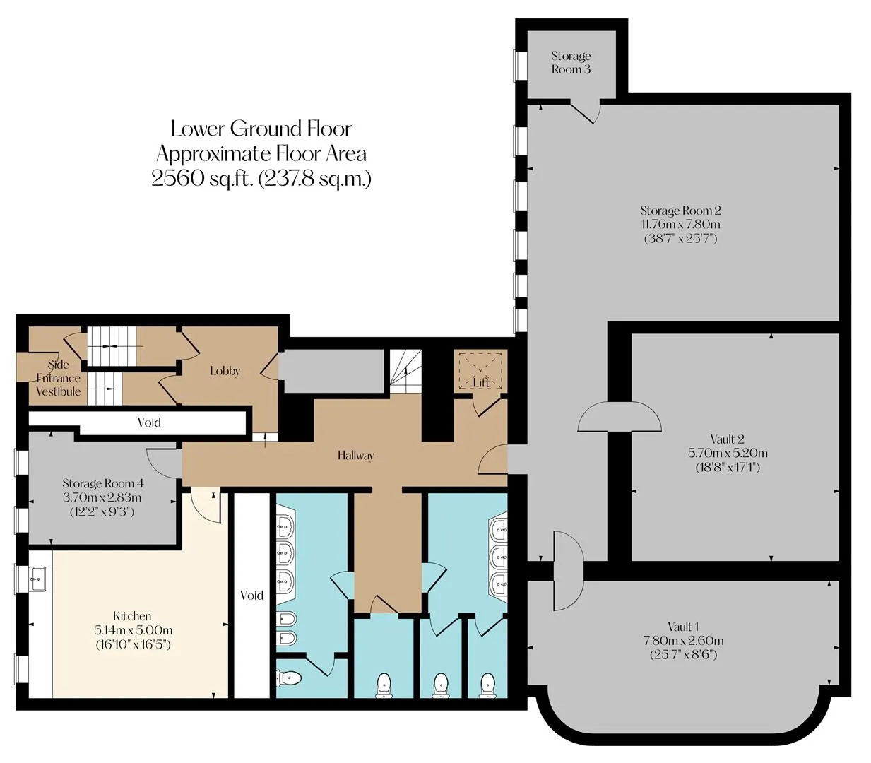 On the lower ground floor: Hallway, storage vaults corridor, vault 1, vault 2, storage room 2, storage room 3, WC 1 with two cubicles, disabled toilet, WC 2 with one cubicle, kitchen, storage room 4, lobby, under-stairs storage cupboard and side entrance vestibule with access to the secondary staircase.