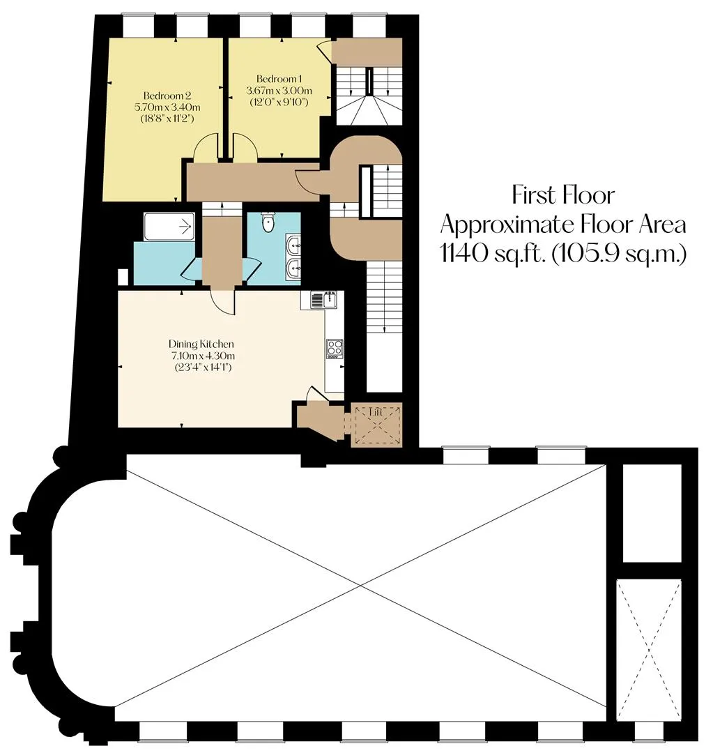 On the first floor (Two Bed Apartment): Main staircase FF, entrance hallway, bedroom 1, bedroom 2, WC, shower room, dining kitchen and lift lobby.