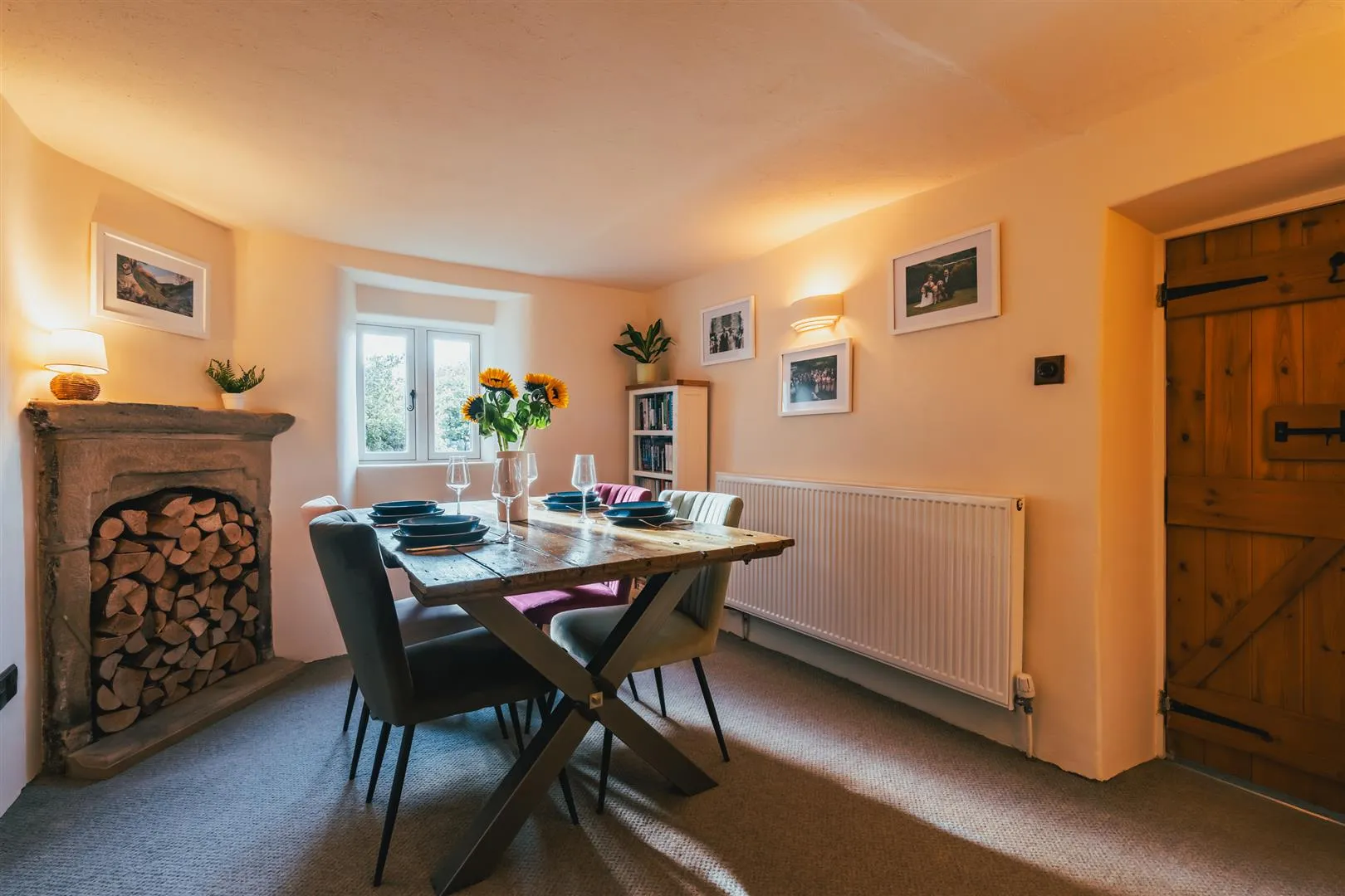A characterful dining room with a front facing UPVC double glazed window, wall mounted light point and a central heating radiator. Fitted furniture includes shelving. The focal point of the room is the decorative fireplace with a stone surround, mantel and hearth. A timber door opens to the inner hallway.