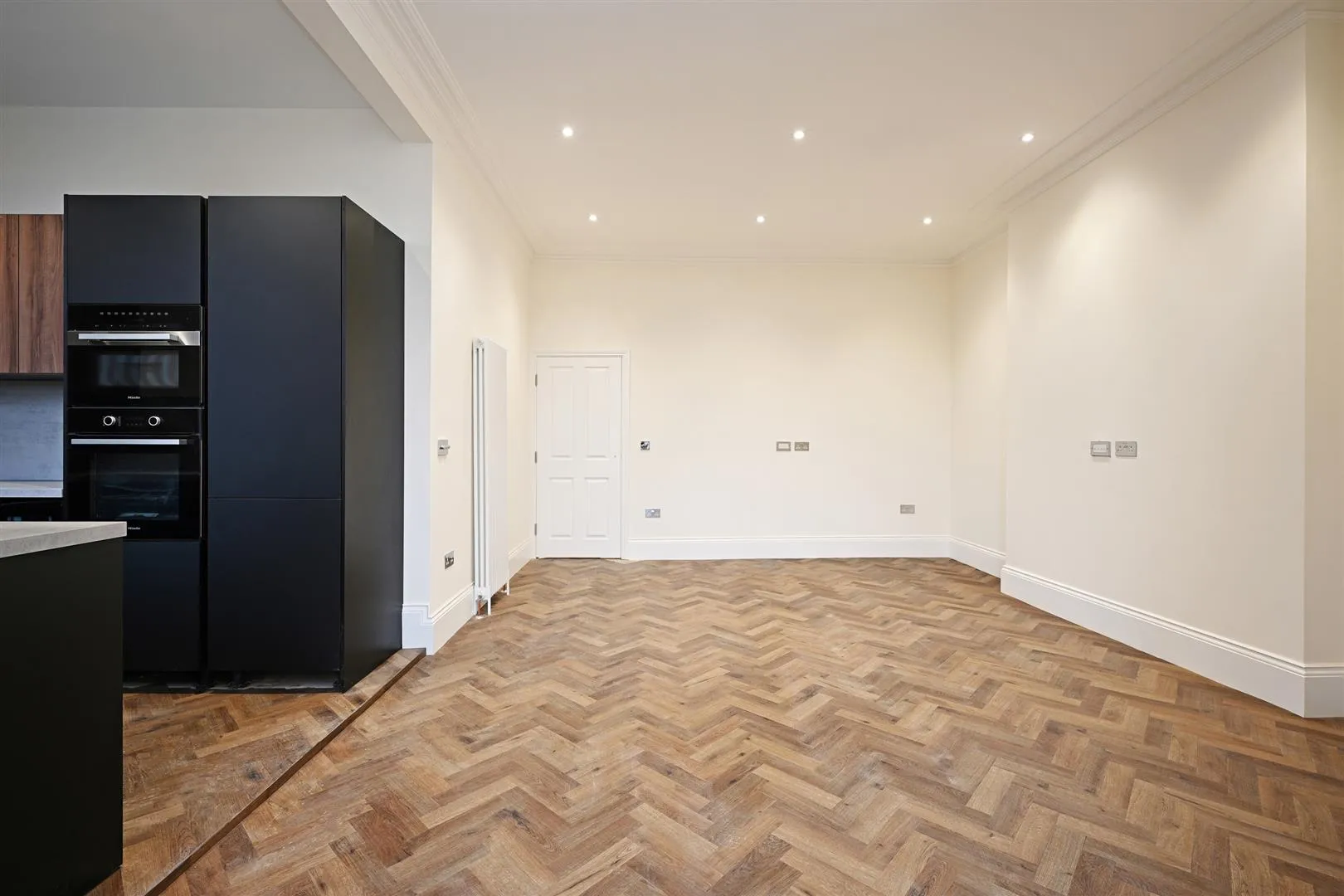 Having a front facing bay window incorporating hardwood double glazed sash windows, coved ceiling, recessed lighting and pendant light points. Also having MVHR vents, central heating radiators, TV/aerial point and deep skirtings. A wide opening leads into the kitchen.