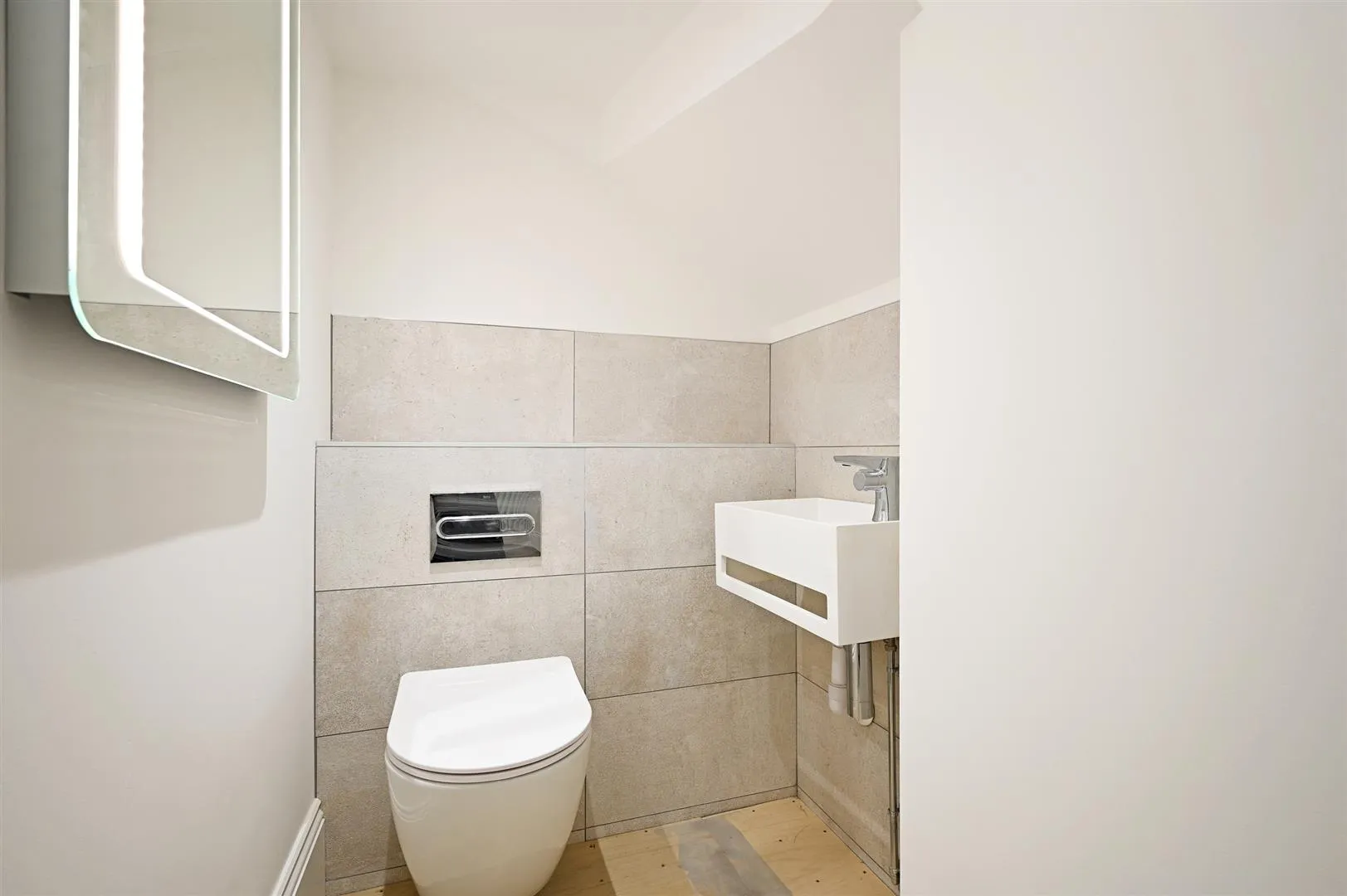 Having recessed lighting, extractor fan, partially tiled walls and deep skirtings. There is a suite in white, which comprises a wall mounted WC and a wall mounted Lusso wash hand basin with a Vado chrome mixer tap.
