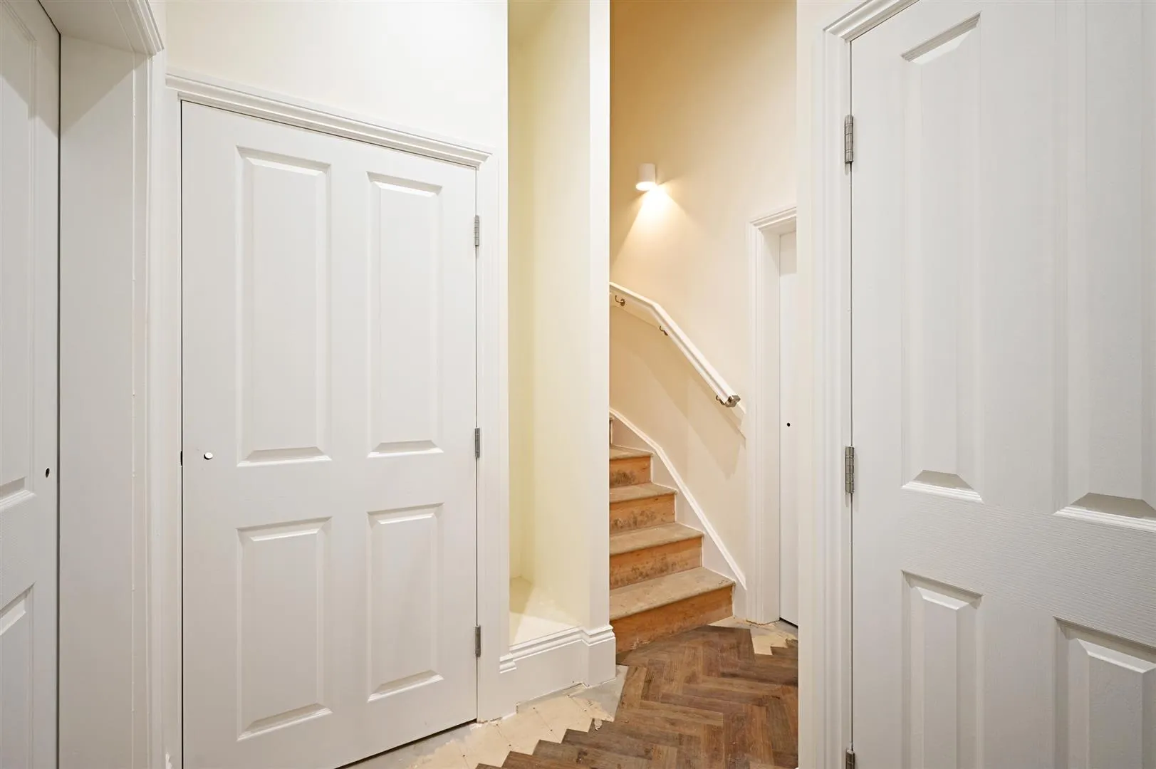 From the entrance hall, a staircase with a timber hand rail rises to the: