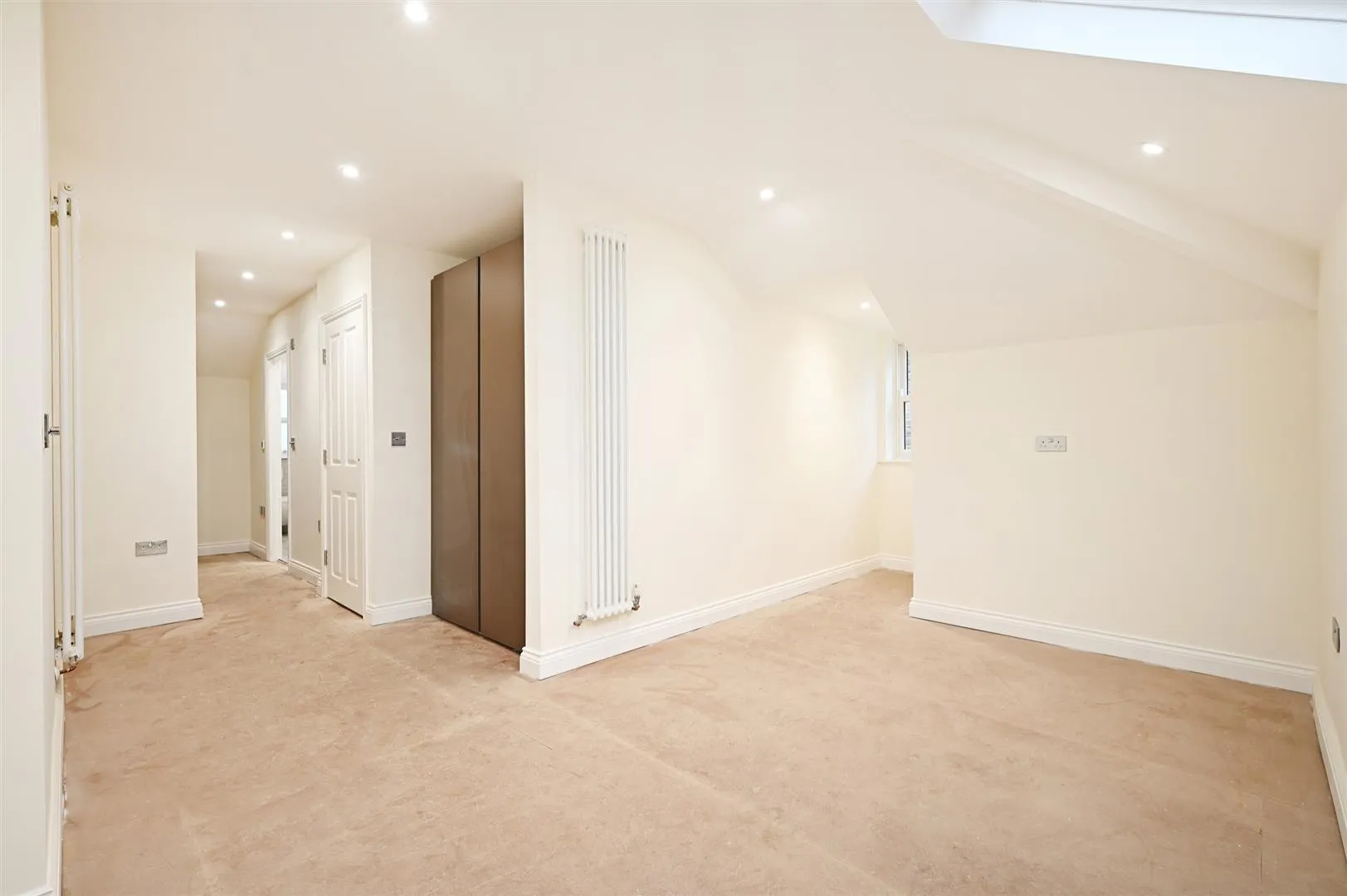 A superb bedroom suite with a Velux roof window, side facing hardwood double glazed sash window, recessed lighting, MVHR vent, central heating radiators and TV/aerial cabling. An opening gives access to the bedroom 2 dressing area.