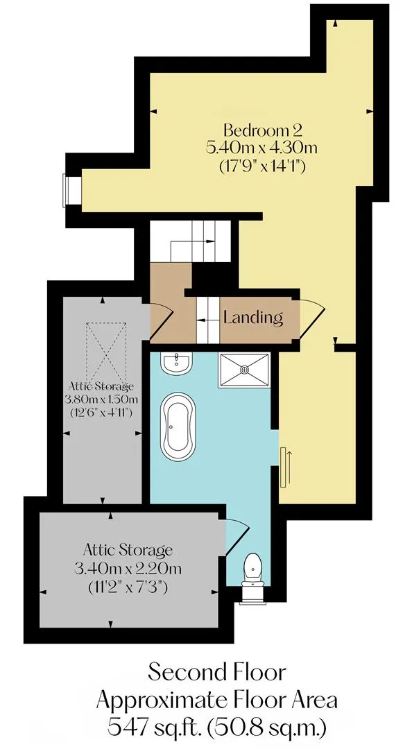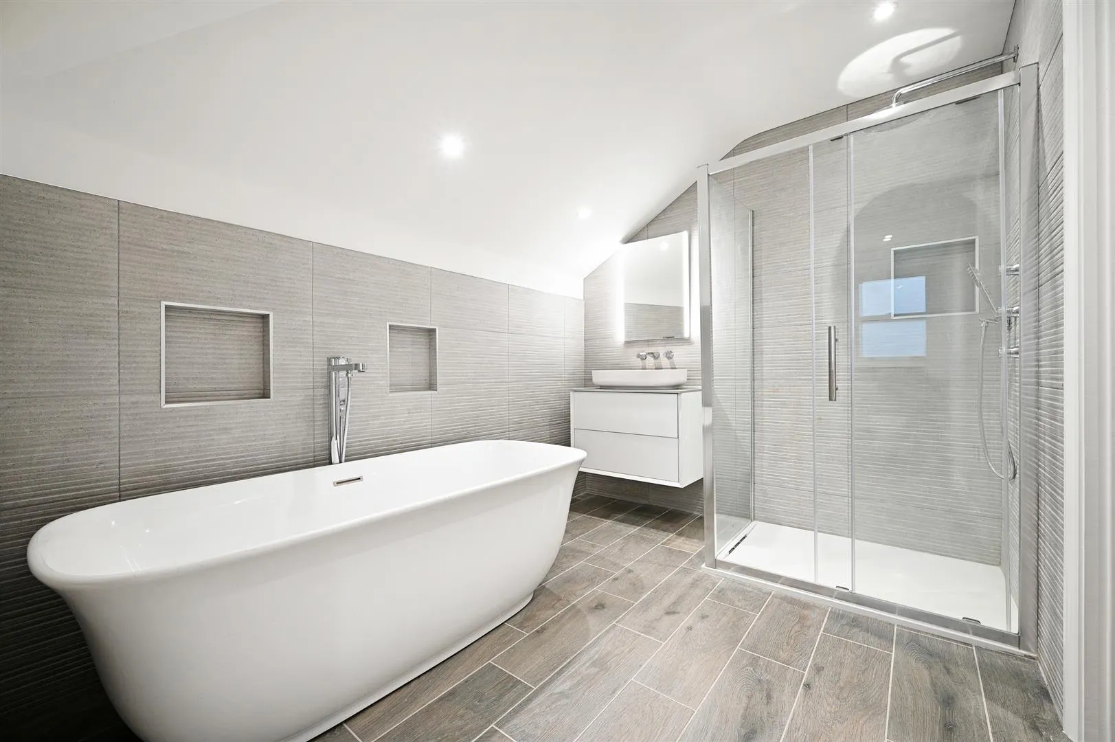 A luxurious en-suite bathroom with a rear facing hardwood double glazed obscured sash window, recessed lighting, extractor fan, partially tiled walls, heated towel rail and tiled flooring. There is a suite in white, which comprises a wall mounted WC and a wall mounted wash hand basin with a Vado chrome mixer tap and storage beneath. Also having a freestanding bath with a chrome mixer tap and a hand shower facility. To one corner is a shower enclosure with a fitted Vado rain head shower, an additional hand shower facility and a glazed screen/door. A timber door opens to eaves storage.