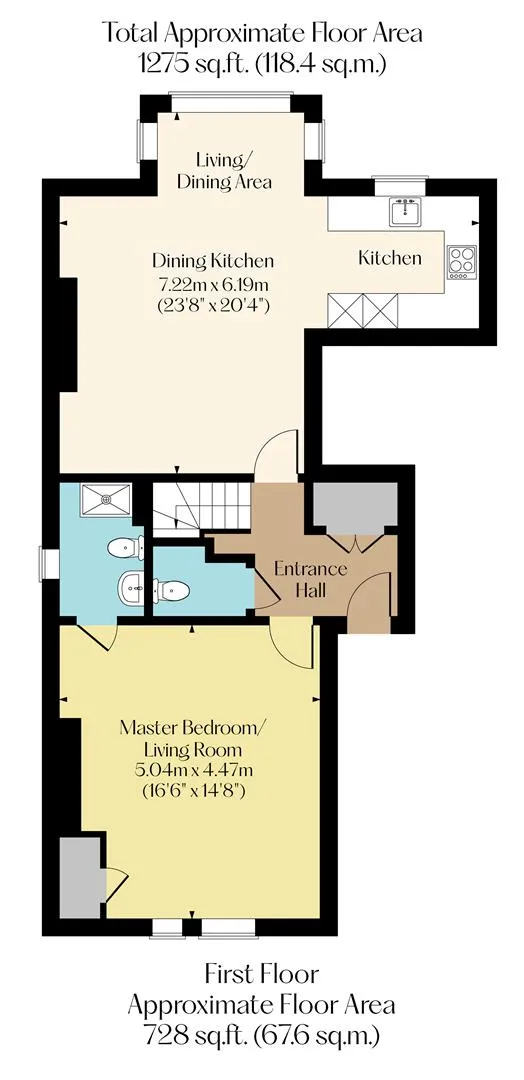 The property briefly comprises of on the first floor: Entrance hall, master bedroom/living room, boiler cupboard, master en-suite shower room, WC, utility cupboard and dining kitchen.