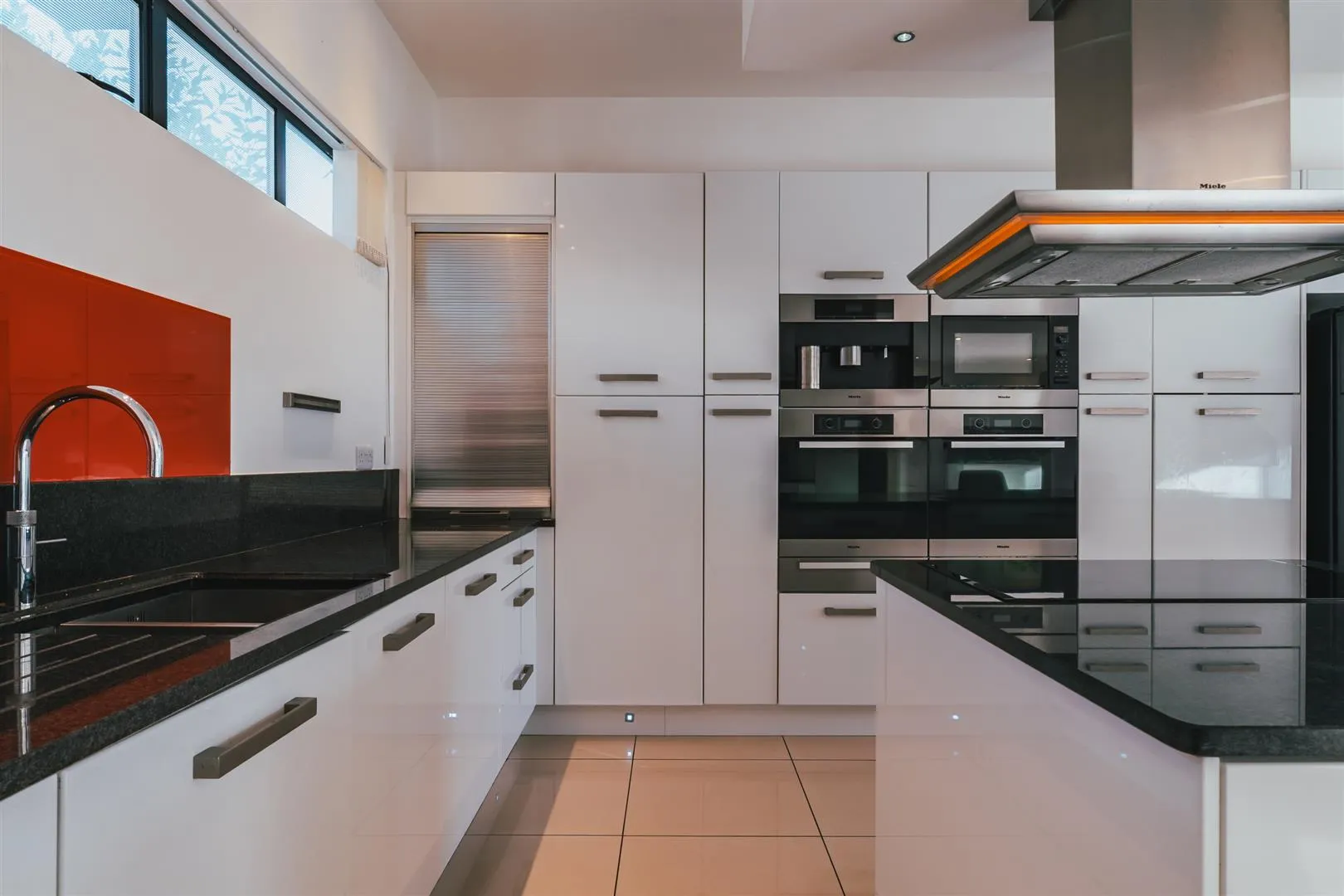 An outstanding dining kitchen of high-quality with a side facing aluminium double glazed panel and a rear facing aluminium double glazed obscured window with matching side panels. There is recessed lighting, a dropped ceiling above the island with feature LED lighting and porcelain tiled flooring with under floor heating. A range of fitted base and wall units incorporate a granite work surface, a granite upstand, plinth lighting and an inset 1.5 bowl Blanco stainless steel sink with a Quooker boiling tap and a glazed splash back. A large central island provides additional storage and has plinth lighting and a granite work surface with two pop-up power points, which extends to provide space for three chairs. The appliances are by Miele and include a four-ring induction hob with an extractor hood above, two fan assisted ovens, a microwave, two warming drawers, a coffee machine and a dishwasher. There is space/provision for an American style fridge/freezer. A sliding aluminium door with a double glazed panel and matching side panels opens to the front of the property.